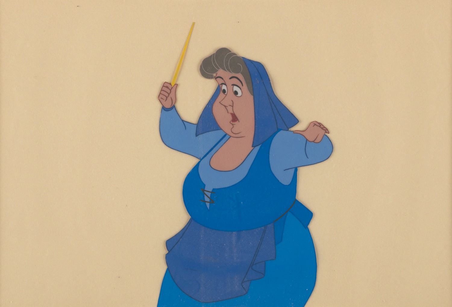 (Disney, 1959) An original production cel of Flora from the dressmaking sequence of Disney's 1959 feature film, "Sleeping Beauty." The cel was originally sold at the Art Corner in Disneyland and has been slightly trimmed and matted at the studio in preparation for sale. The image of Flora measures 3.5"x6" and the entire matted piece measures 12"x9".   The artwork is in very good condition with all paint intact. The Disneyland Gold Label is still attached to the reverse.