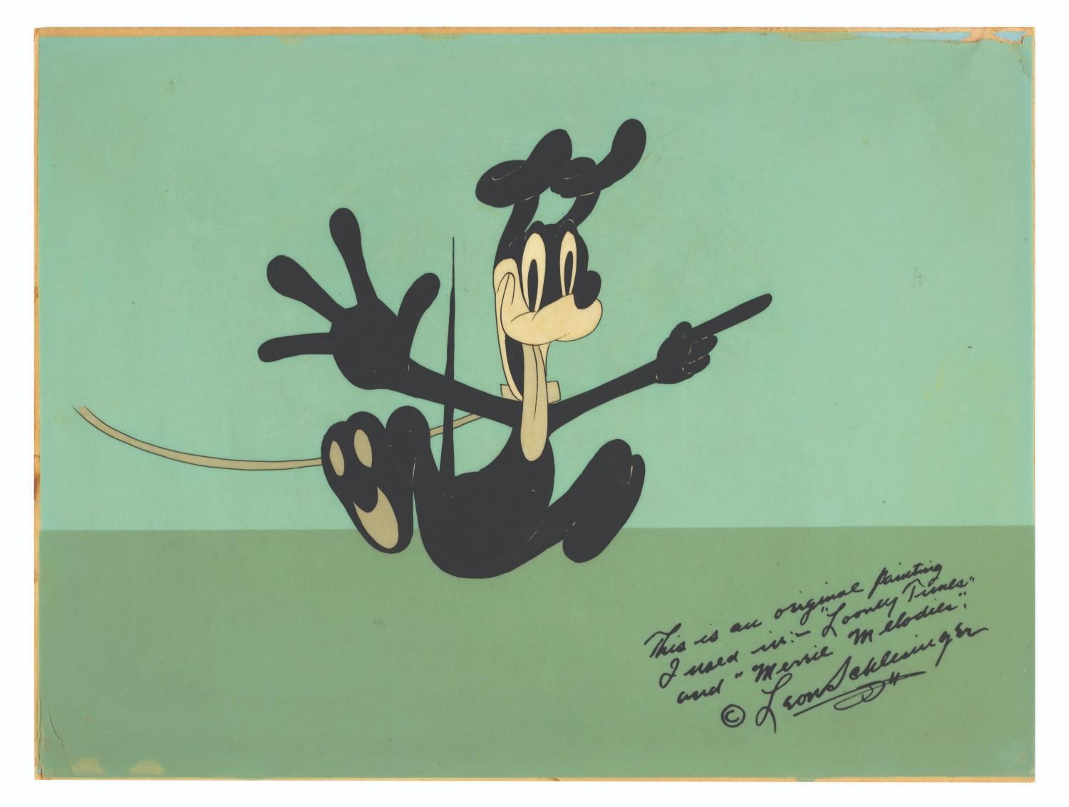 (Warner Bros, 1939) An original production cel from the 1939 Looney Tune “The Film Fan” directed by Bob Clampett. The cel has been trimmed and placed on a painted color background and bears a silk screen signature of Leon Schlesenger, the producer of the short along with the rest of the Looney Tunes through 1944. The cel measures 9” x 12” and is in good condition with very light paint cracking in the lower left corner and top right corner which does not affect the image.