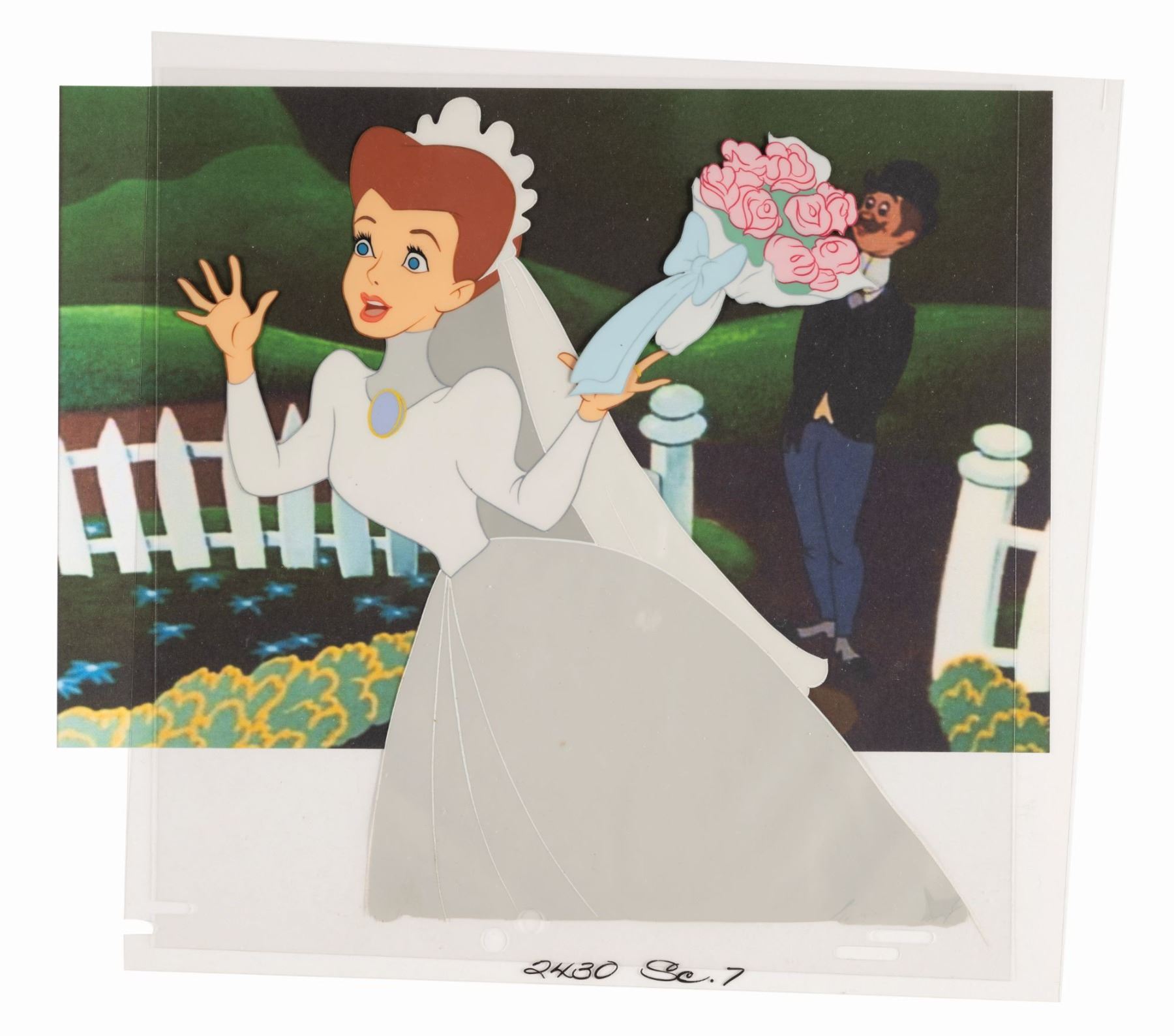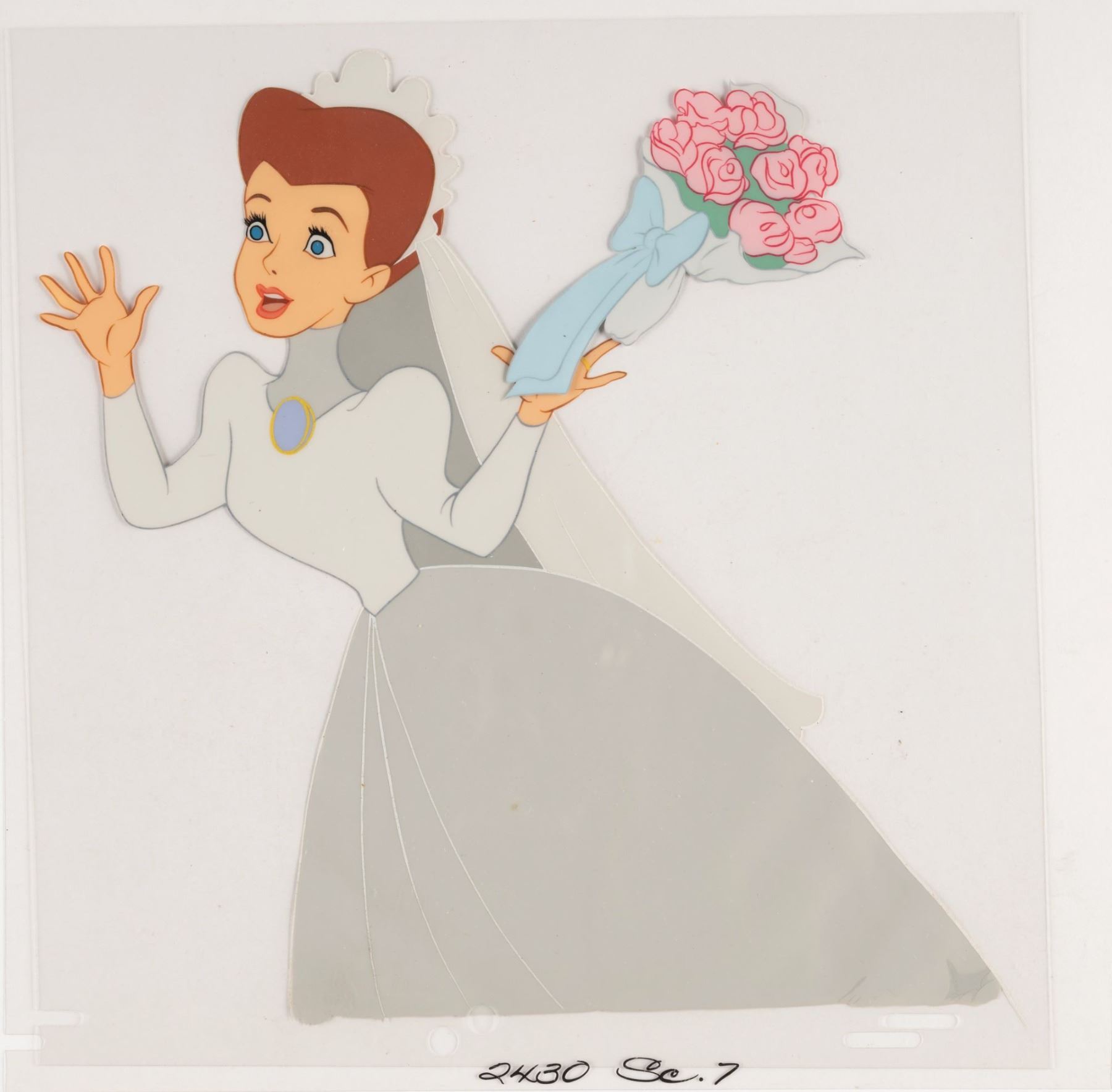 (Disney, 1952) An original production cel of the bride from Walt Disney's 1952 short,"The Little House." The bride has an image size of 6.5"x7.54" on a slightly trimmed 9"x9" cel. The bouquet is on a separate trimmed cel. The cel has been placed on a color copy background for presentation. The cel is in fine condition with all paint intact.
