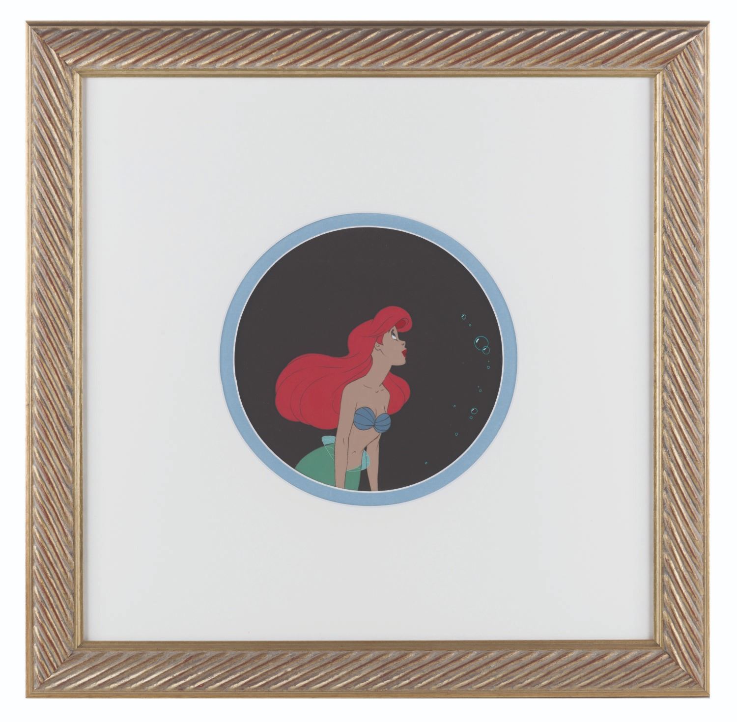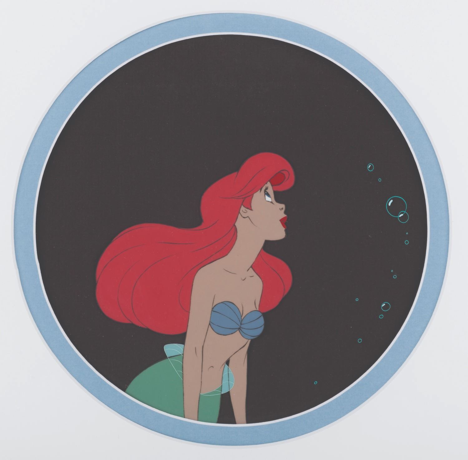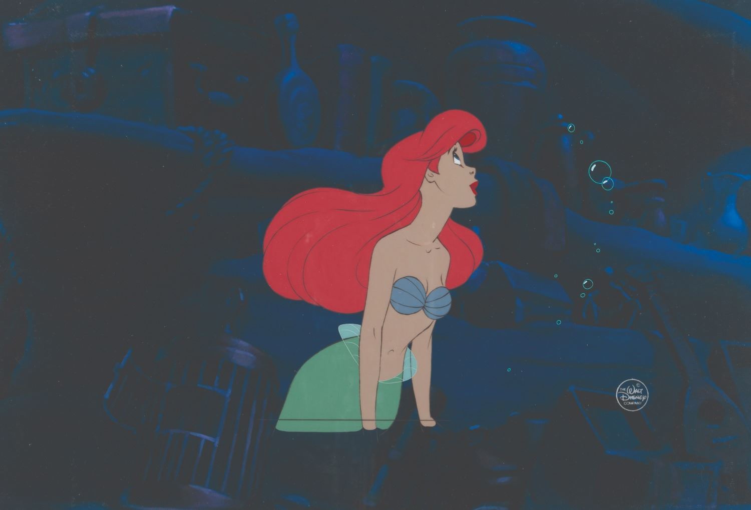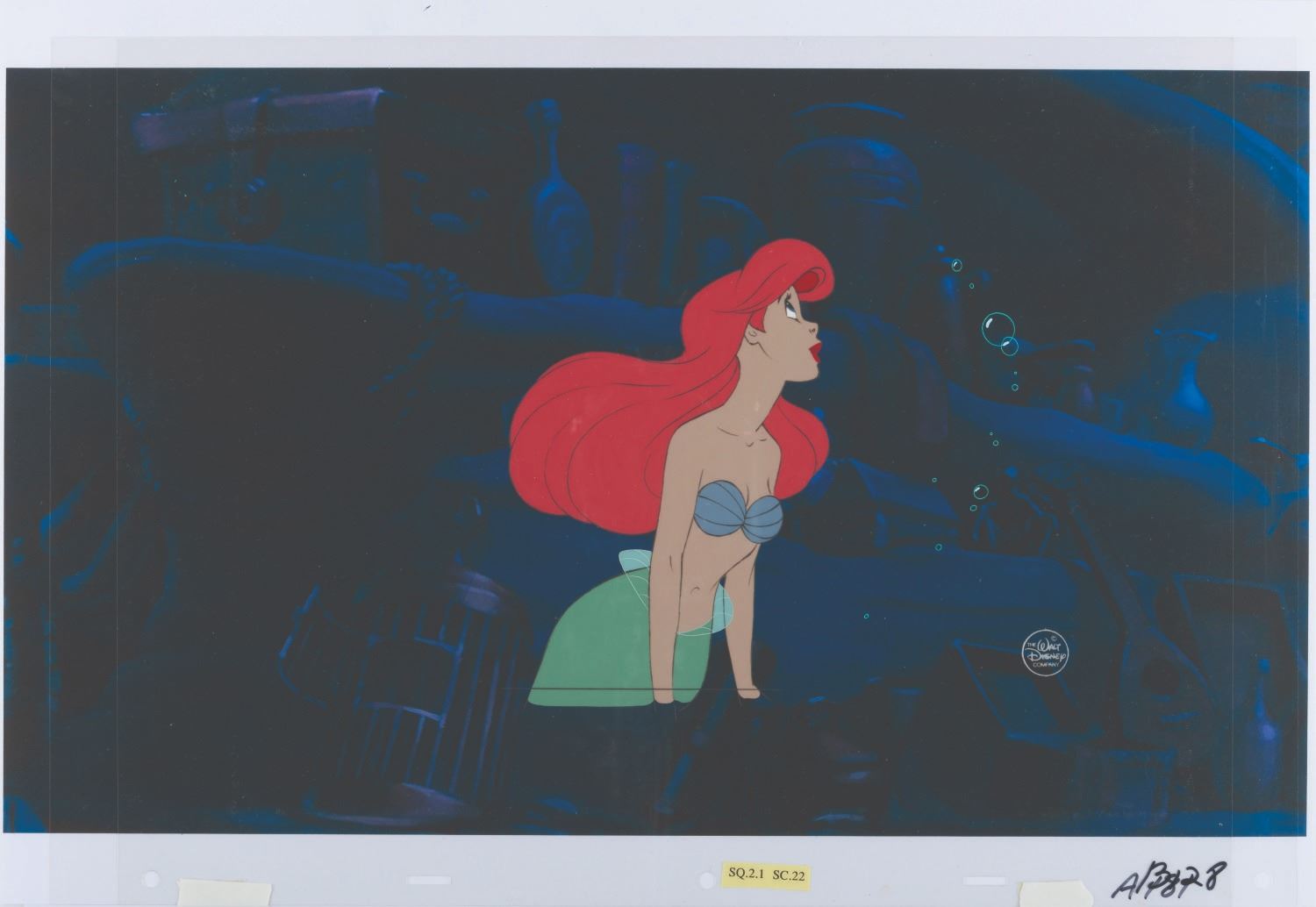 (Disney, 1989) An original multi-layer production cel of Ariel from "The Little Mermaid” paired with a color copy background. Ariel has an image size of 6.75” x 4.75” on an untrimmed 12.5” x 16” cel over a 13” x 19” background. The cel is in fine condition.