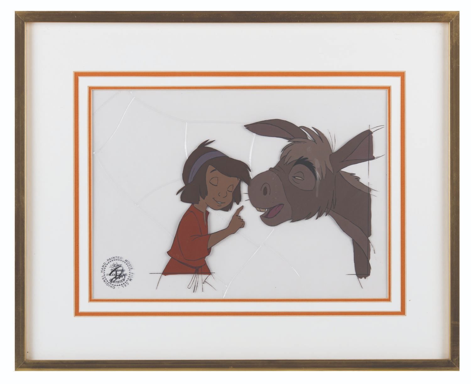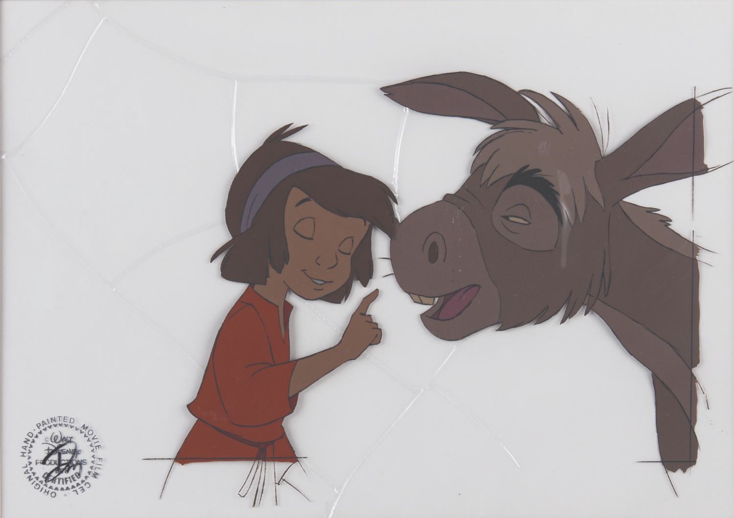 (Disney, 1978) An original production cel of the Boy and Small One from Disney's 1978 featurette,"The Small One." The characters of the boy and the donkey have an image size of 8.25"x6.75" on an untrimmed 12.5"x16" cel. The cel is in very good condition with ripples under one cel layer and a Disney Seal at the lower left.