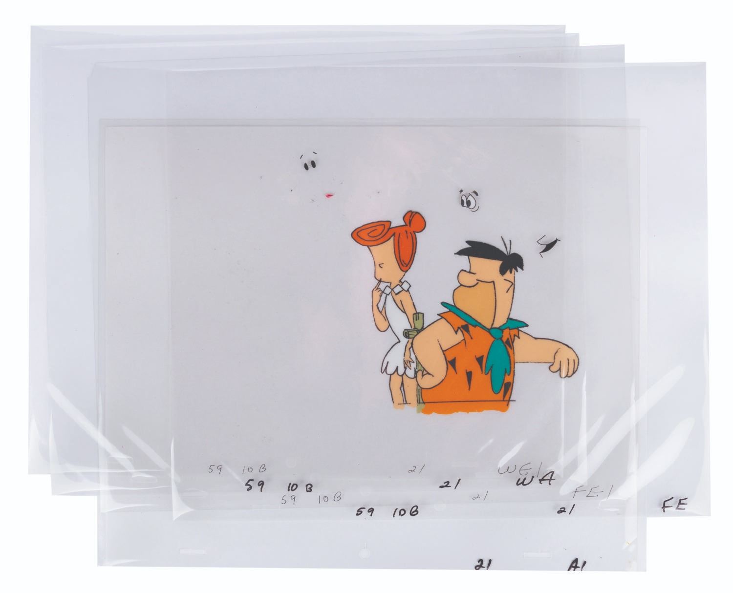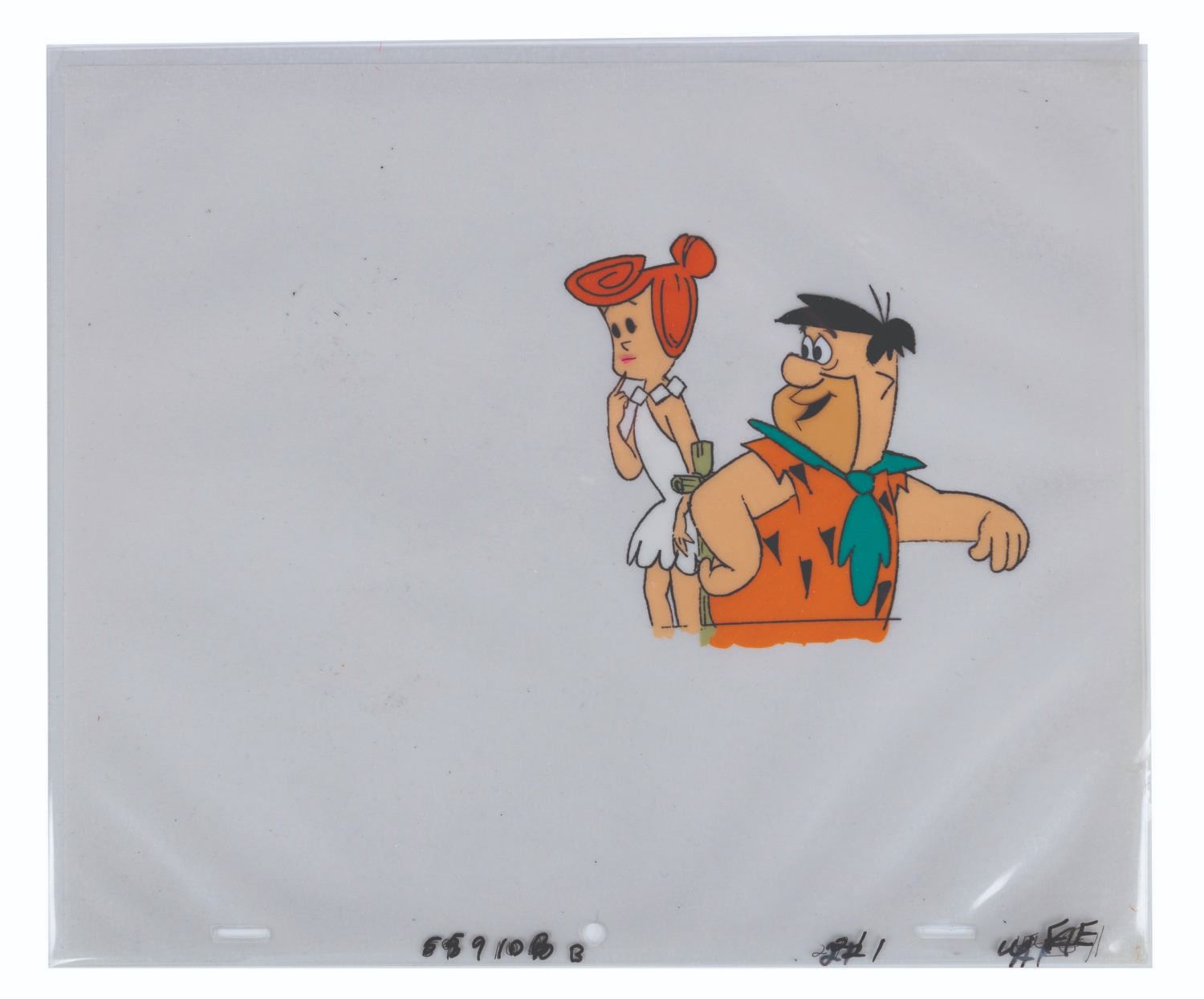 (Hanna-Barbera, 1980) An original multi-cel set up of Fred and Wilma Flintstone, from the Flintstones Comedy Hour. The five untrimmed cels measure 10.5"x12.5" and the total image size of the characters is 5"x5.5". The cels are in very good condition.