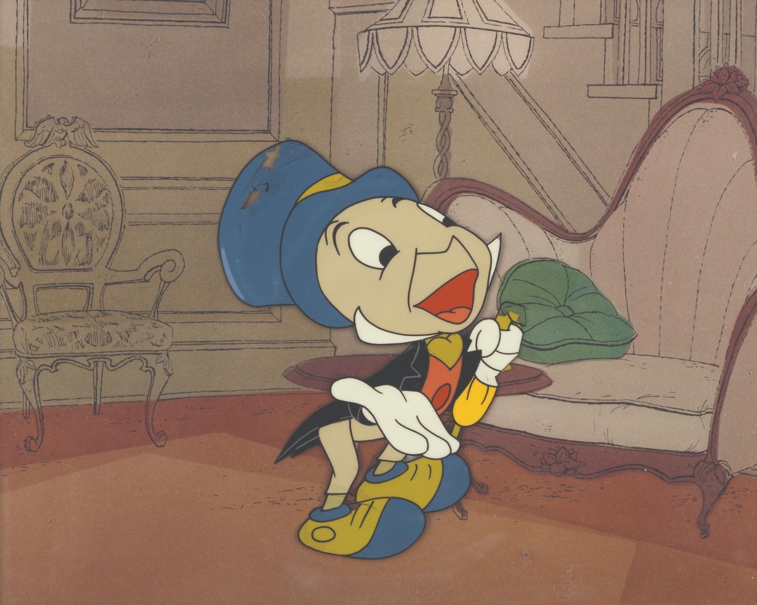(Disney, 1950s) An original production cel of Jiminy Cricket from an unknown television appearance. The cel was slightly trimmed at the studio, placed on a color copy background, and matted in preparation for sale at the Art Corner in Disneyland. It is still in its original matte and retains the original Art Corner gold label on the reverse. Jiminy’s image size is 4.25” x 5.5” on a slightly trimmed 12” x 10” cel. The entire matted piece measures 12” x 14”. The artwork is in good condition with paint loss in Jiminy’s hat and umbrella handle, and some cracking in his shoes.