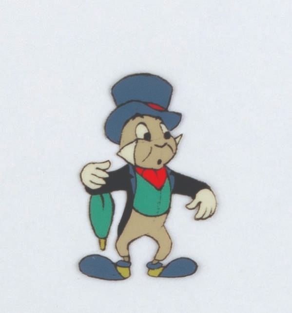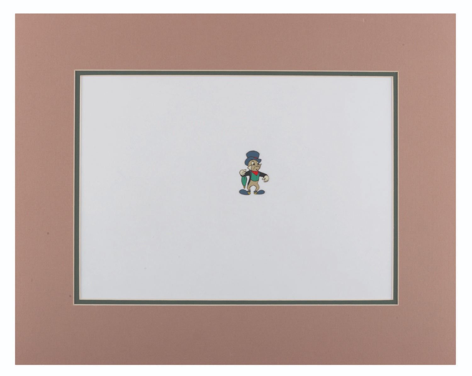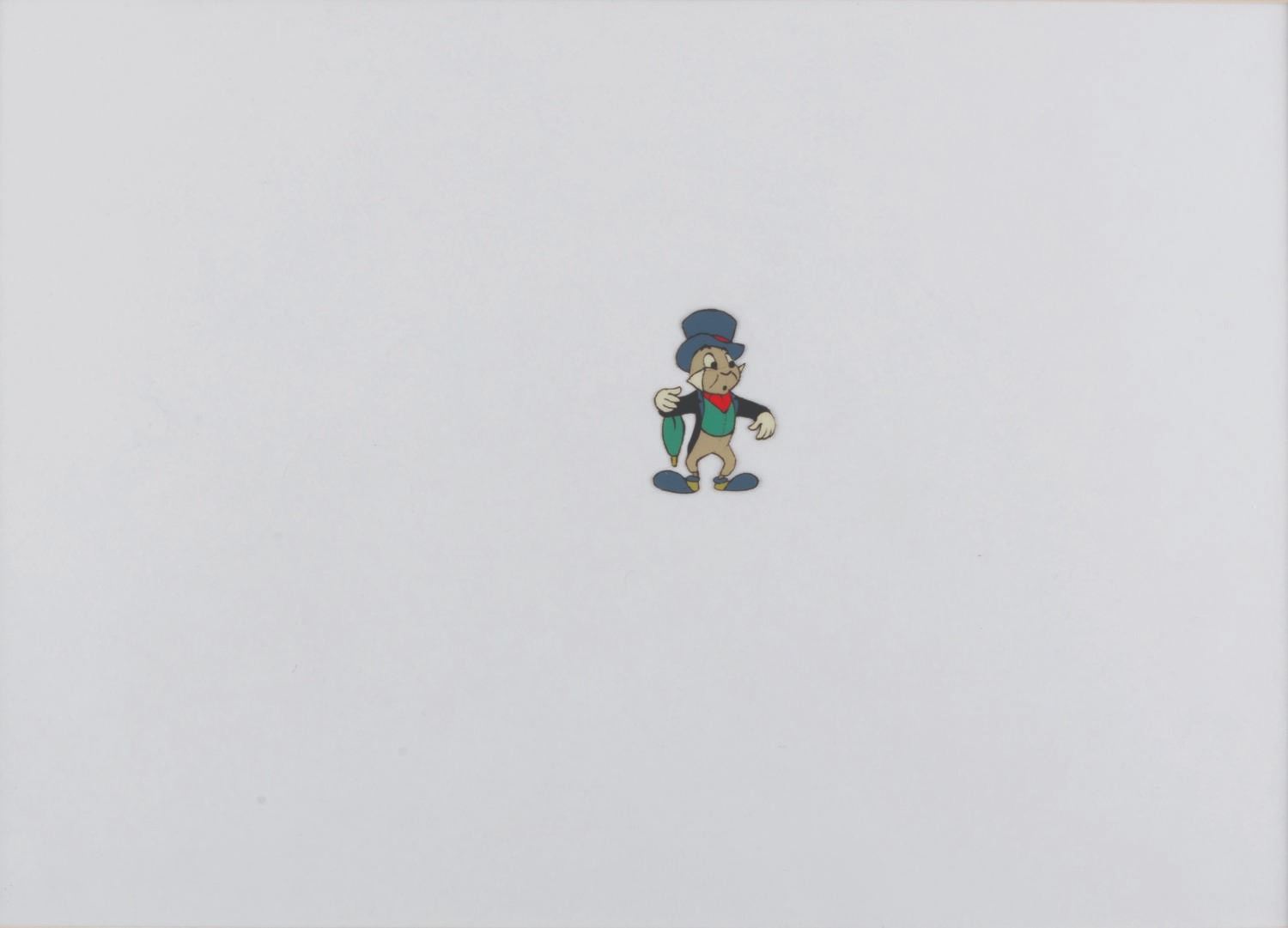 (Disney, 1950-60s) An original production cel of Jiminy Cricket from one of his many television appearances. Jiminy has an image size of 1.25 " x 2 " on a 12.5 " x 16.5 " cel in a 16 " x 20 " backless matte. The art is in fair condition with spots of paint loss throughout and wear from production use.