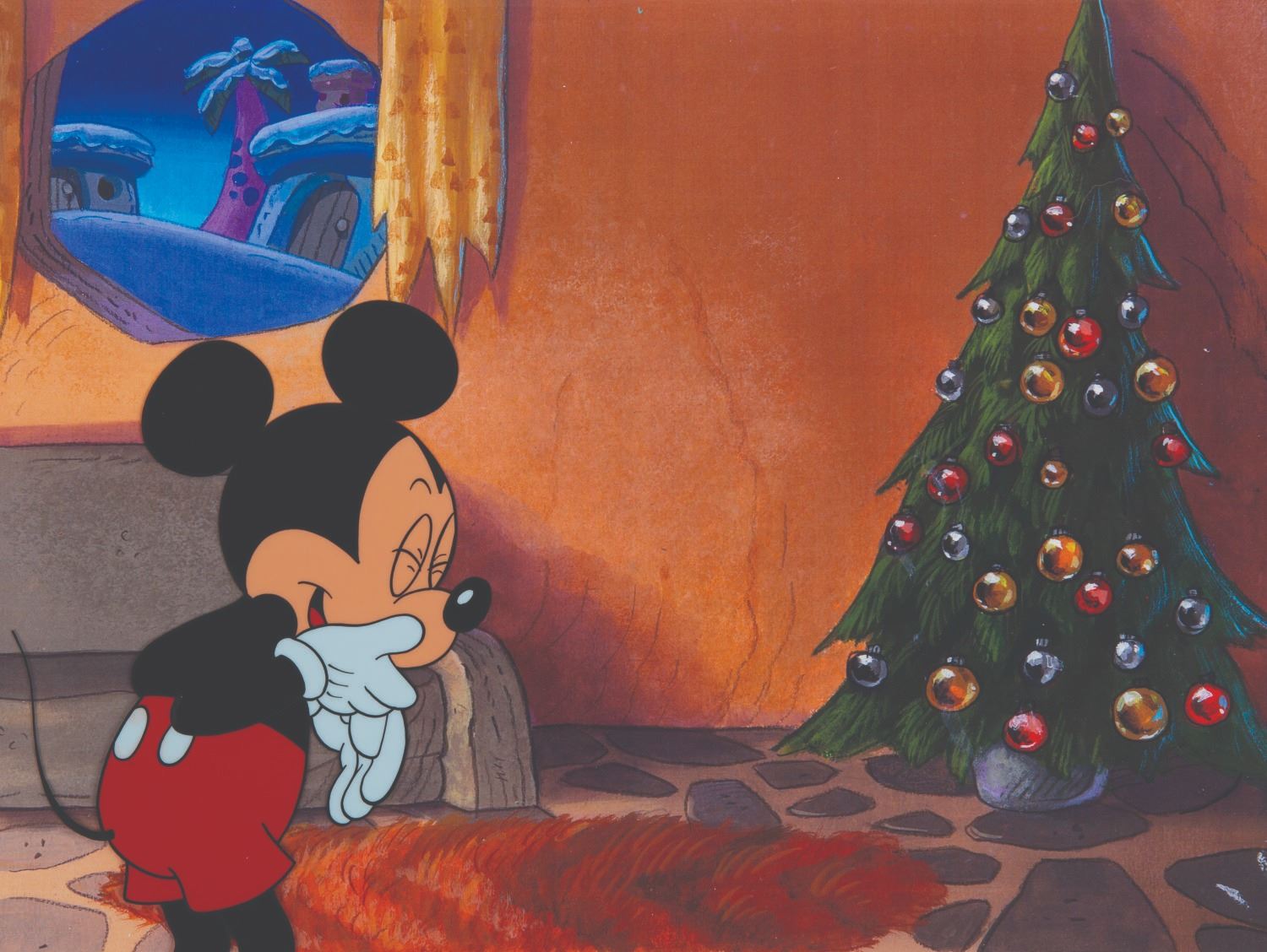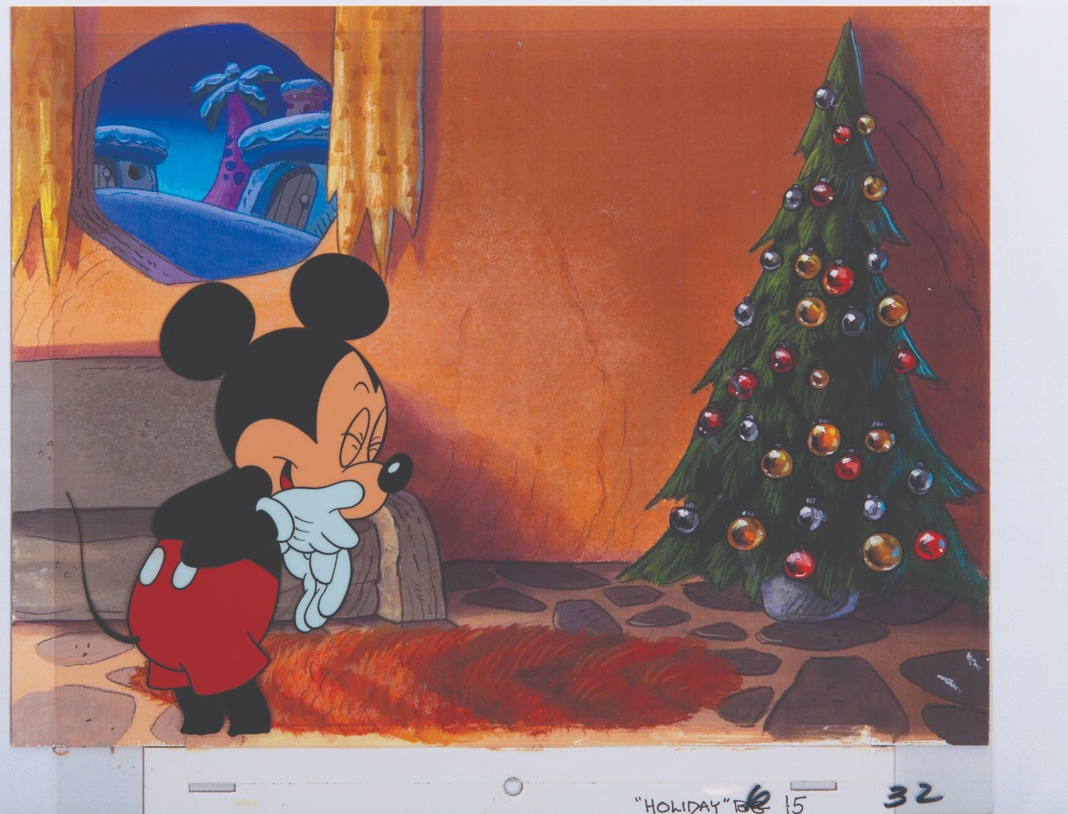 (Disney, 1980s) An Original production cel featuring Mickey Mouse from a Hardee's commercial. Mickey has an image size of 4.5"x6.5" on an untrimmed 12.5"x10.5" cel. The cel has been placed on a color copy background and is in very good condition with minor wear.