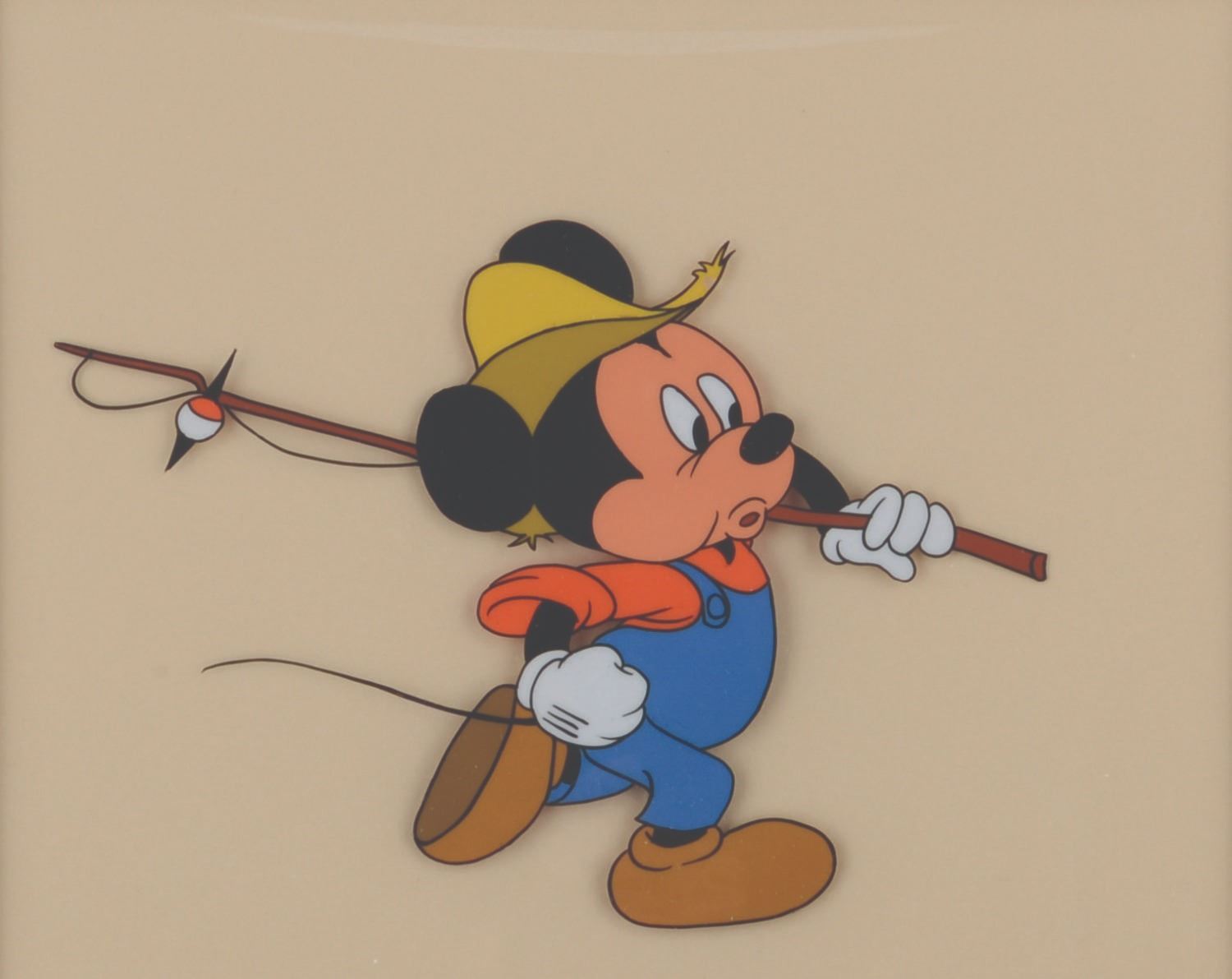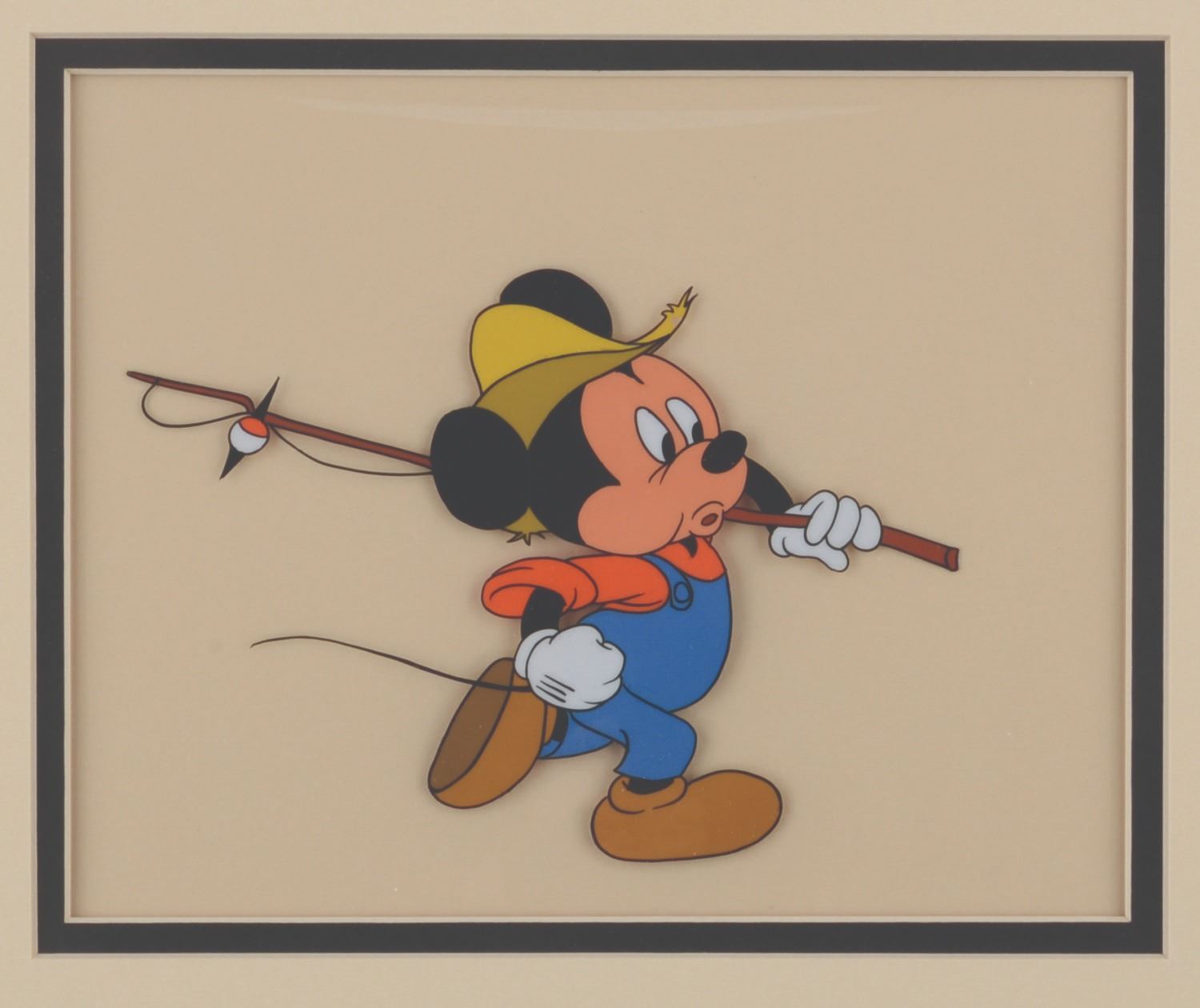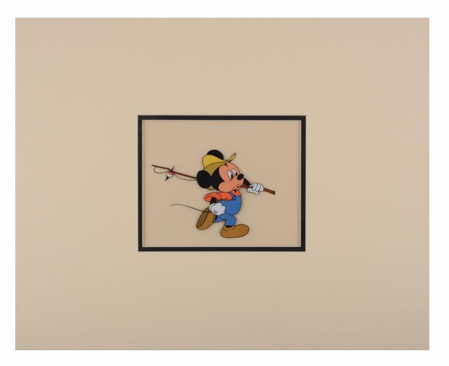 (Disney, 1950s-80s) A production cel of Mickey Mouse for an unknown production. Mickey has an image size of 4.25" x 6.25" on a 12.5" x 17" cel. The entire matted piece measures 16" x 20" and is in good production-used condition with light soiling. The matte exhibits minimal edge wear and discoloration from handling and age.