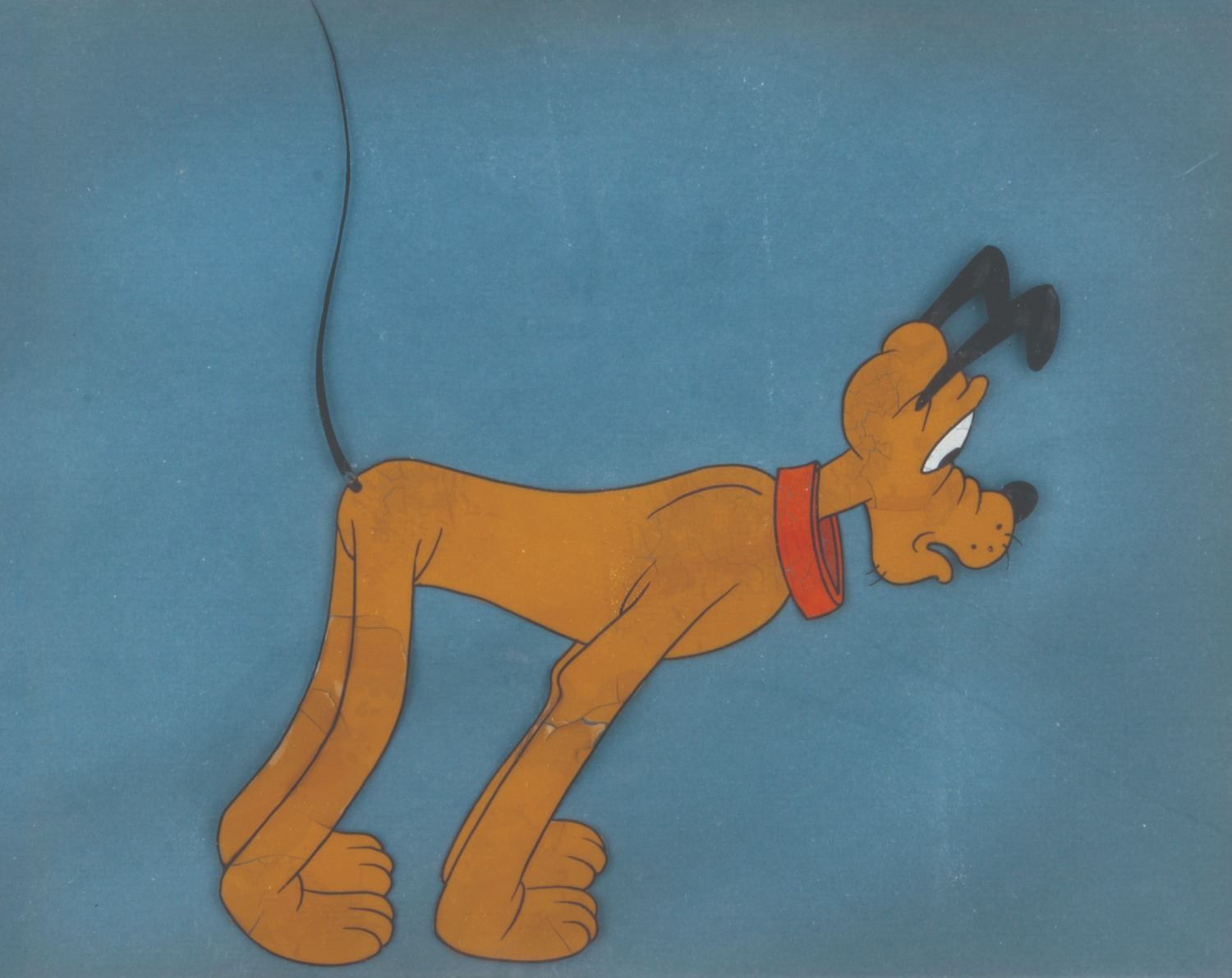 (Disney, 1940s-50s) An original production cel of Pluto, likely from a theatrical short. Pluto has an image size of 7” x 6.5” on a 7.5” x 9.5” visible cel. The entire matted and framed piece measures 14.25” x 16.25”. The artwork displays in good condition with paint cracking throughout, light warping from age and light scratches to the frame.