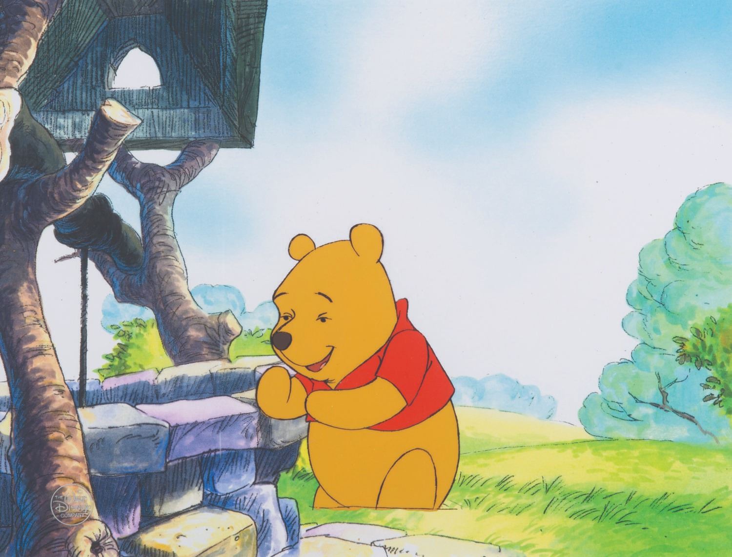 (Disney, 1988-91) An original production cel of Winnie the Pooh from"The New Adventures of Winnie the Pooh." Pooh has an image size of 3.25"x4.75" on an untrimmed cel. The cel comes with a color copy background, and has been matted for display within a 18.5"x5.75" frame. This piece is in fine condition.