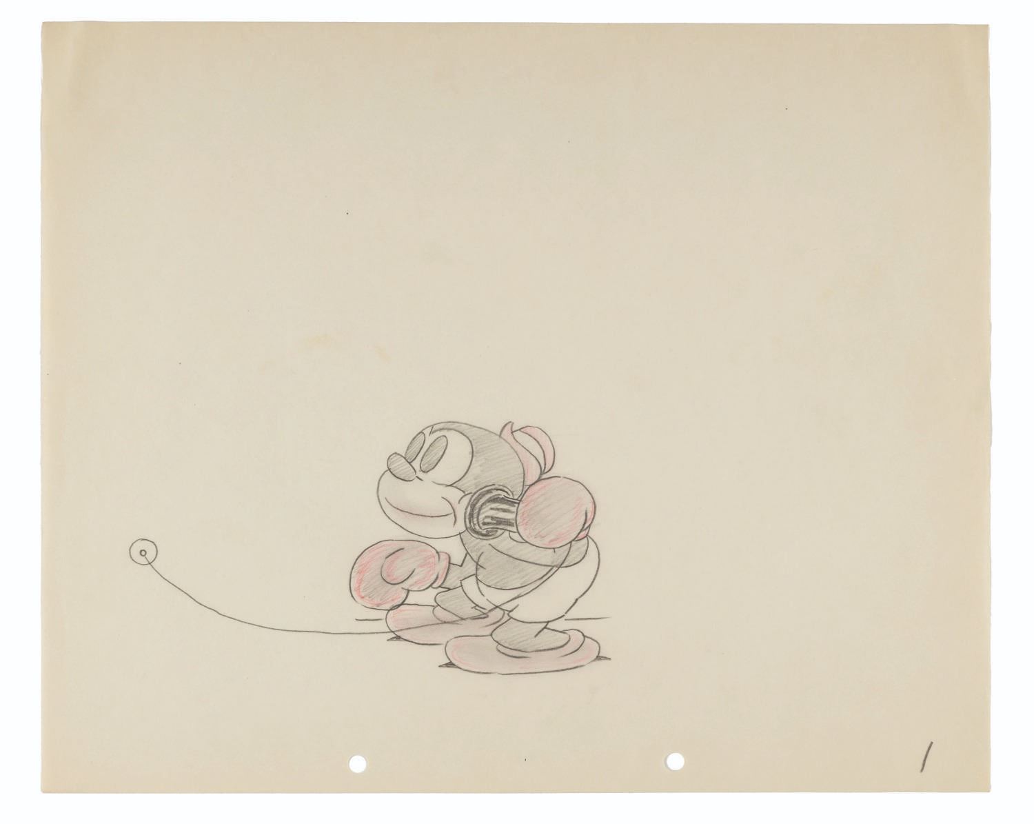 (Harman-Ising, 1932) An original production drawing of Bosko from the Looney Tunes short “Battling Bosko.” Accomplished in graphite and colored pencil, with a character image size of 3” x 3.25” on 9.75” x 12” animation paper, the drawing is in very good condition with light creasing and edge wear from production use and light discoloration from age.