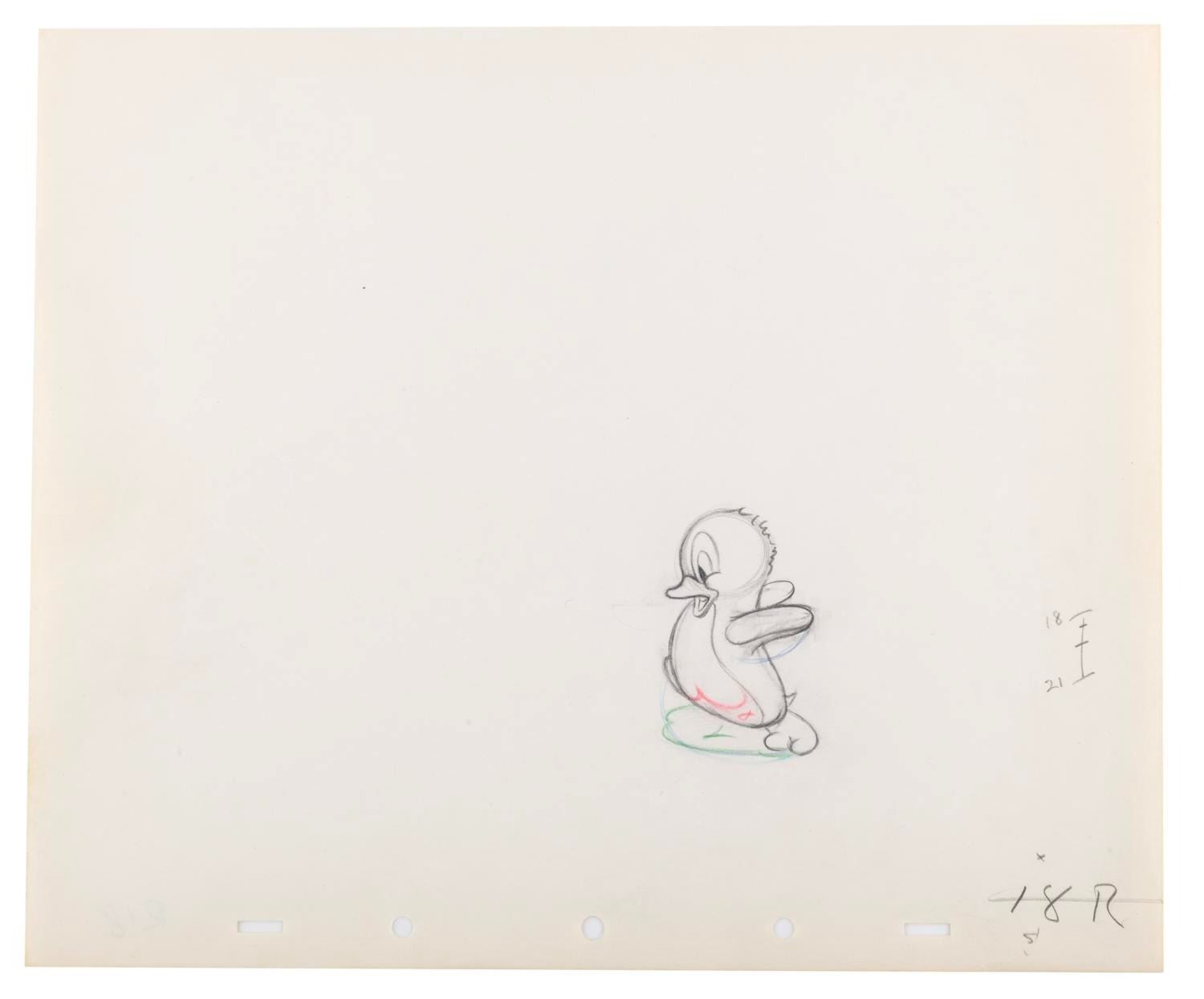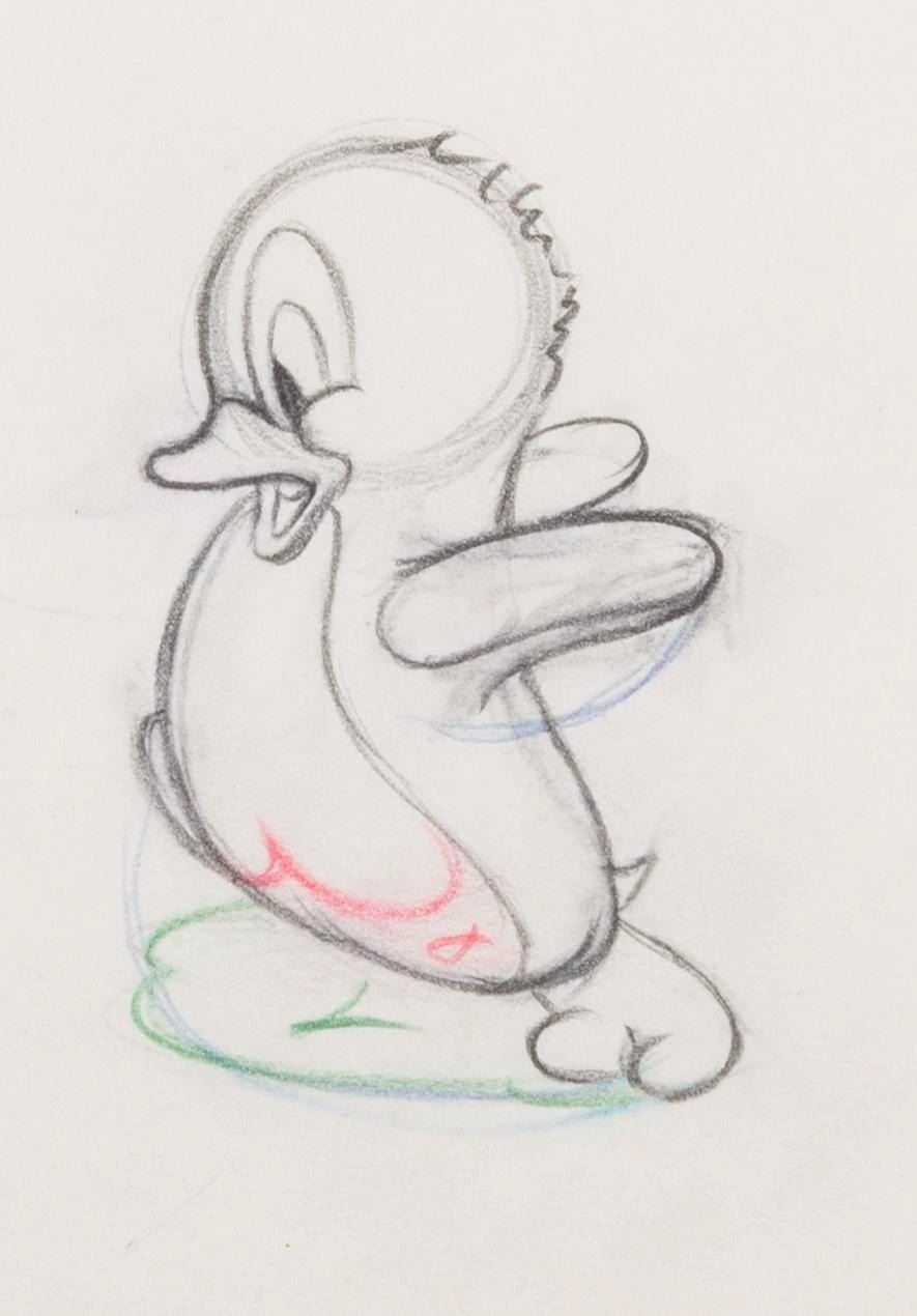 (Disney, 1939) An original production drawing of Tootsie from the 1939 Donald Duck Short, "Donald's Penguin." The image of Tootsie measures 1.5" x 2.5" on untrimmed 10"x 12" animation paper. The drawing is in very good condition with expected wear from age.