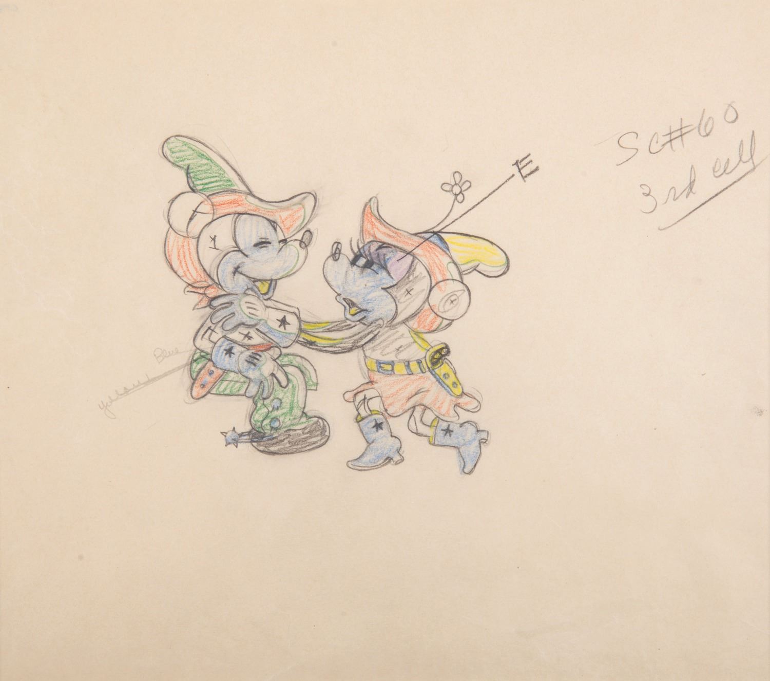(Disney, 1934) An original production drawing of Mickey and Minnie Mouse from "Two Gun Mickey." Accomplished in colored pencil and graphite, the total image size is 4.5"x4.5" on untrimmed 9.5"x11.5" animation paper. The artwork is in very good condition with minor wear and yellowing from age.