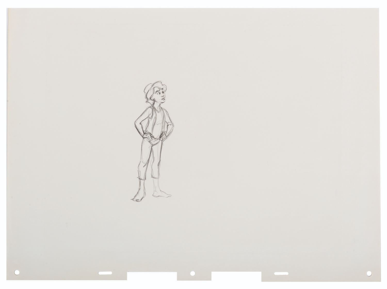 (Disney, 1992) An early rough animation drawing of Aladdin from Disney’s "Aladdin." The image size of the character is 2"x5.75” on untrimmed 17”x12.5” animation paper. The artwork is in very good condition with expected wear.