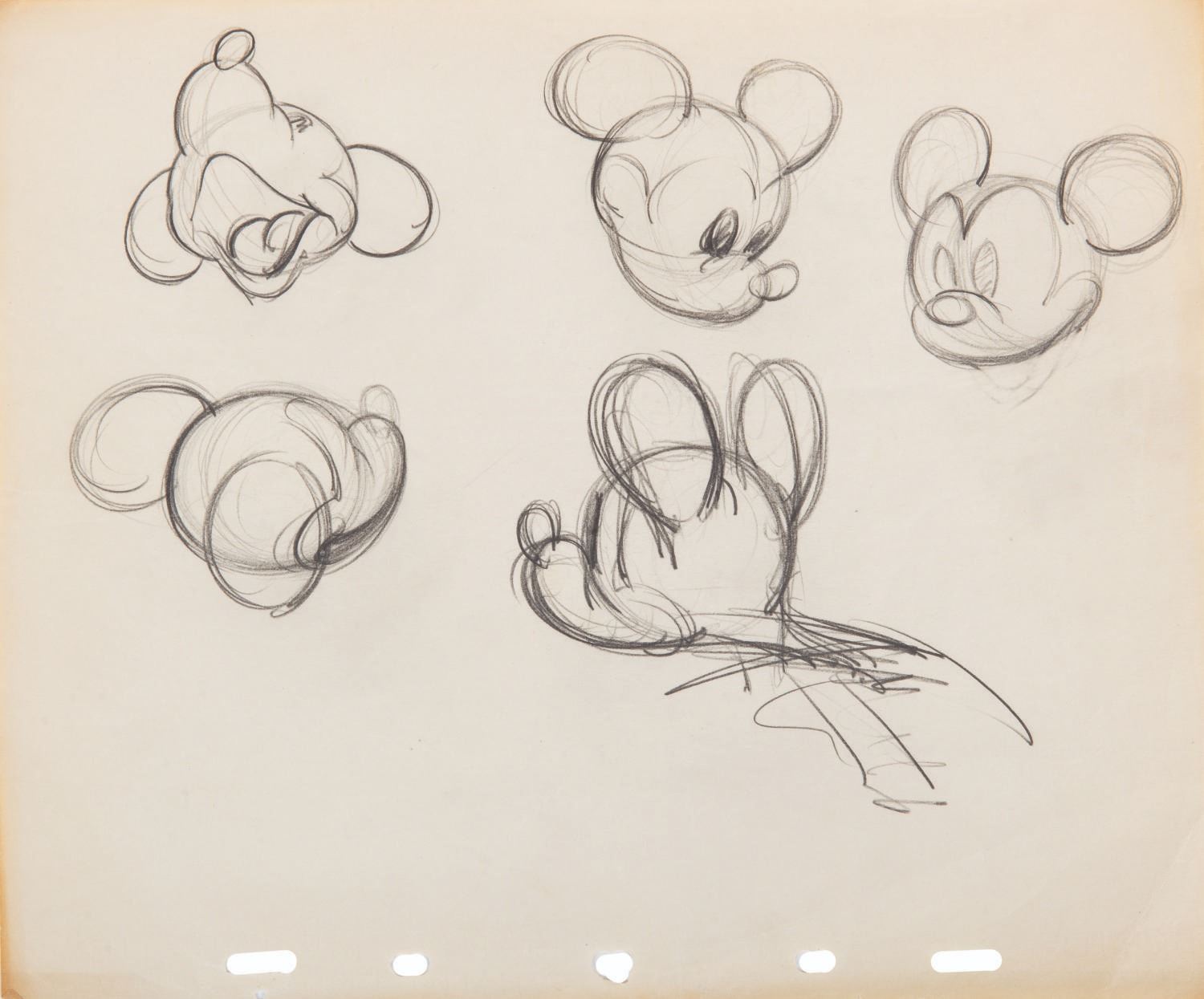 (Disney, 1930s-40s) An original rough drawing of Mickey Mouse head-turns from an unknown Walt Disney Production. The artwork measures a complete 11"x8.25" on its 12"x10" animation paper and is in fine condition.