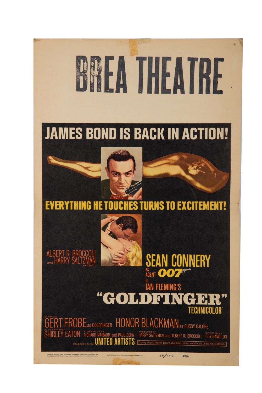 (United Artists, 1964) A rare original release window card for "Goldfinger," starring Sean Connery. Measuring 14"x22", the piece is in very good overall condition with a horizontal crease from folding, minor yellowing, tape residue, and wear to edges from mounting.