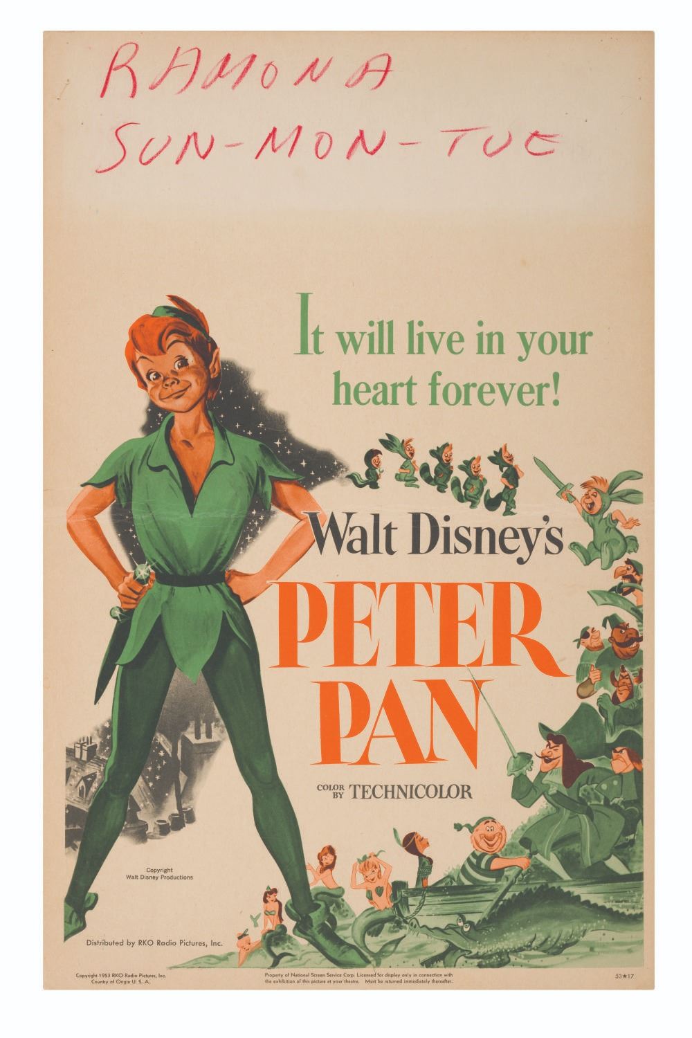 (Disney, 1953) A window card for the original release of Peter Pan. Measuring 14"x22", the card is in very good condition, with a crease across the middle from folding, light wear to edges and corners from age, a .5" thin pen mark across the mermaid illustration at bottom center, and show times written in the area left blank at the top for that purpose.