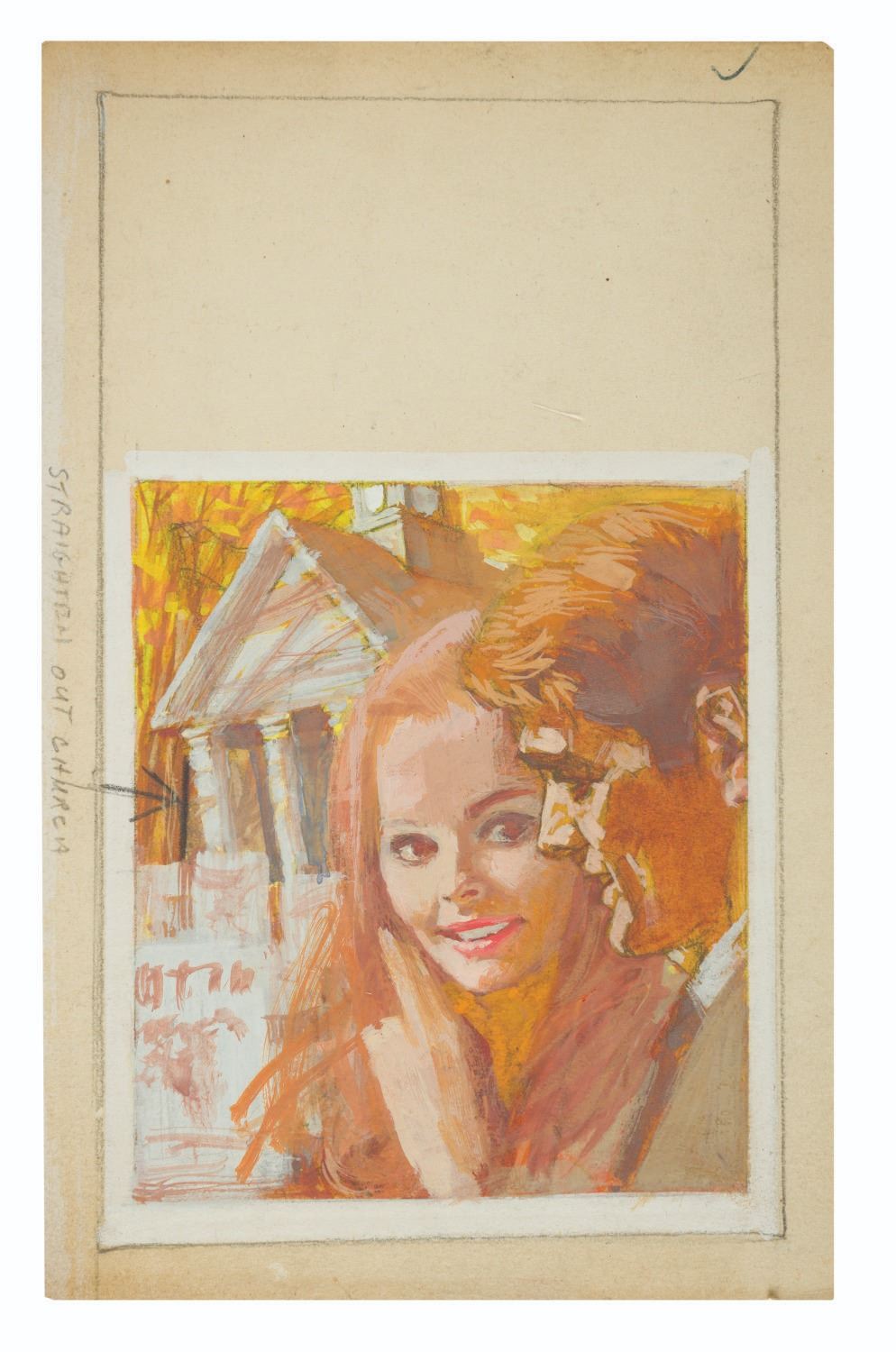 (1960s-70s) An original cover layout painting for an unknown romance novel. Accomplished in gouache, the painted area measures 4.2" x 4.8" within a 4.2" x 7" penciled rectangle denoting the dimensions of a full paperback cover. An editorial note in pencil suggests a change to the angle of the background church in the final piece. On artboard measuring 5" x 8", the piece is in very good production-used condition.