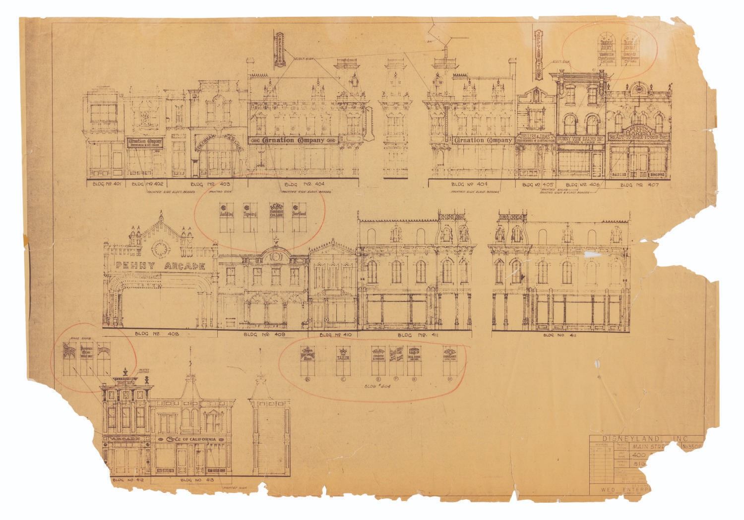 (Disneyland, 1955) An original sheet of plans for Main Street shop buildings at Disneyland. Included are elevations for Carnation, Penny Arcade, Sunny View Farms Jams & Jellies, and Cole of California, with details and notes about the windows above each shop. Measuring 42"x30.25", the sheet is in fair and fragile condition with creases, tears, and wear to its edges and throughout, and much of the title block area missing.