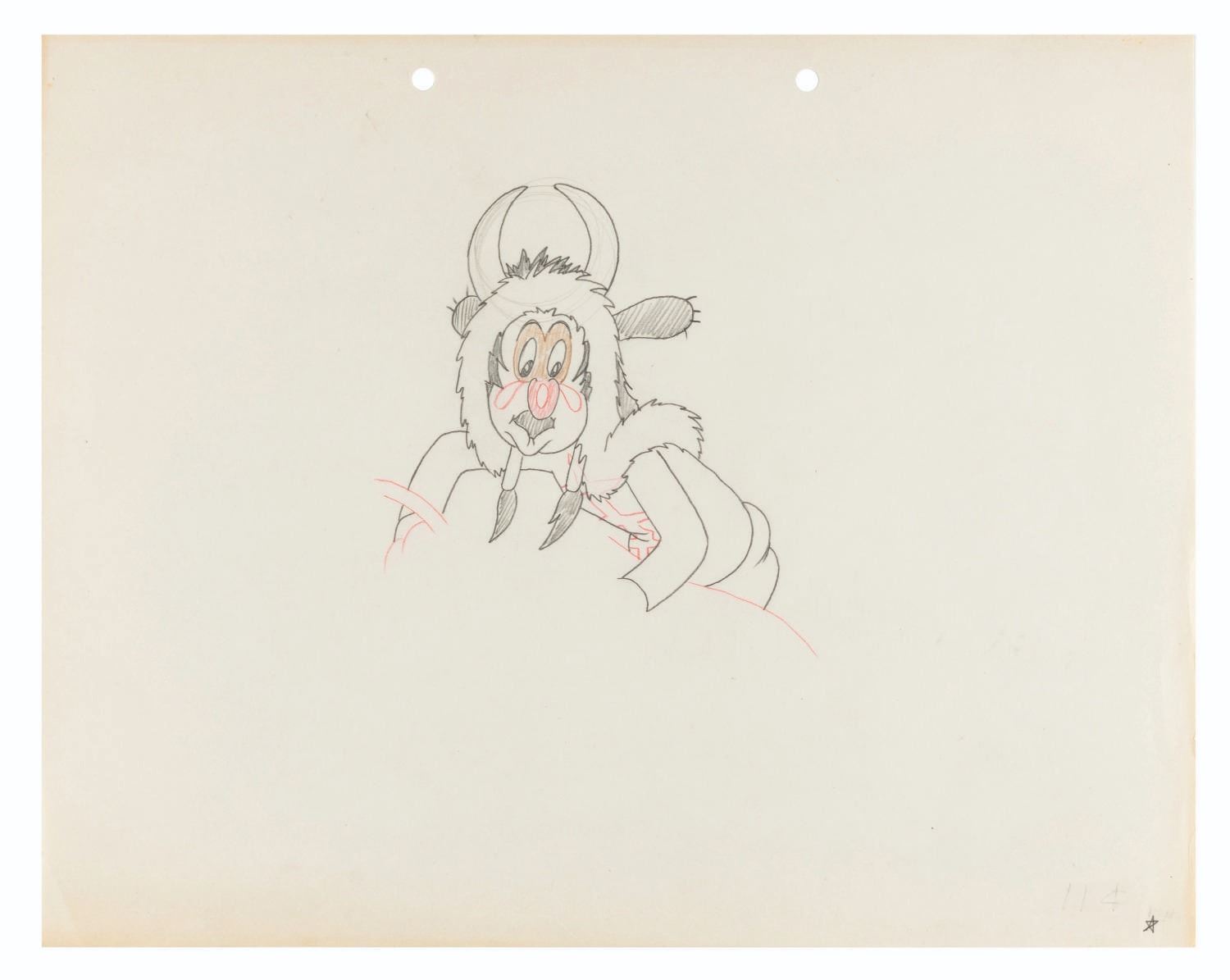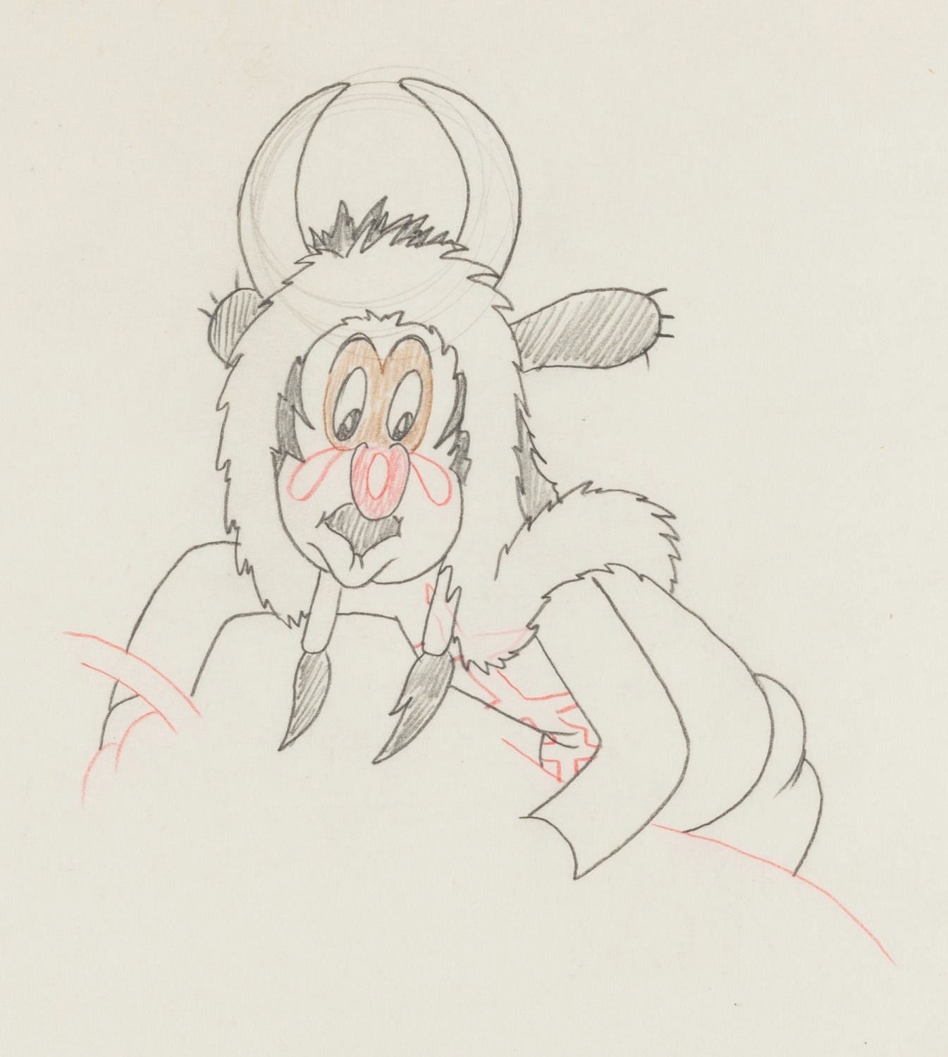 (Warner Bros., 1939) An original production drawing of an Indigenous American from the Merrie Melodies short "Sioux Me." Accomplished in graphite and colored pencil with an image size of 4.75" x 5" on 9.5" x 12" animation paper, the drawing displays in good to very good condition with discoloration along the edges, light smudges, soft creases to the bottom left, and a light crease to the top right.