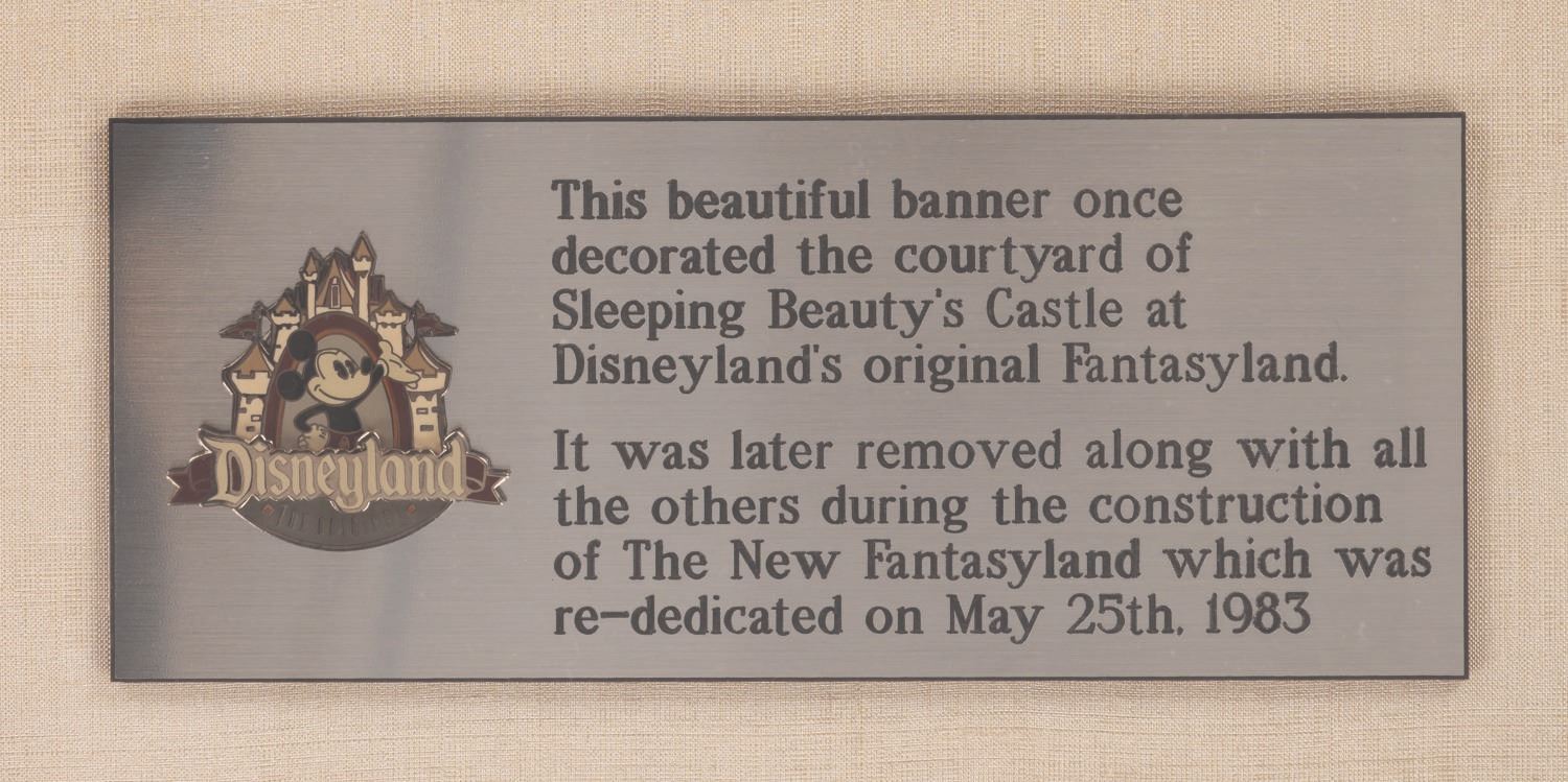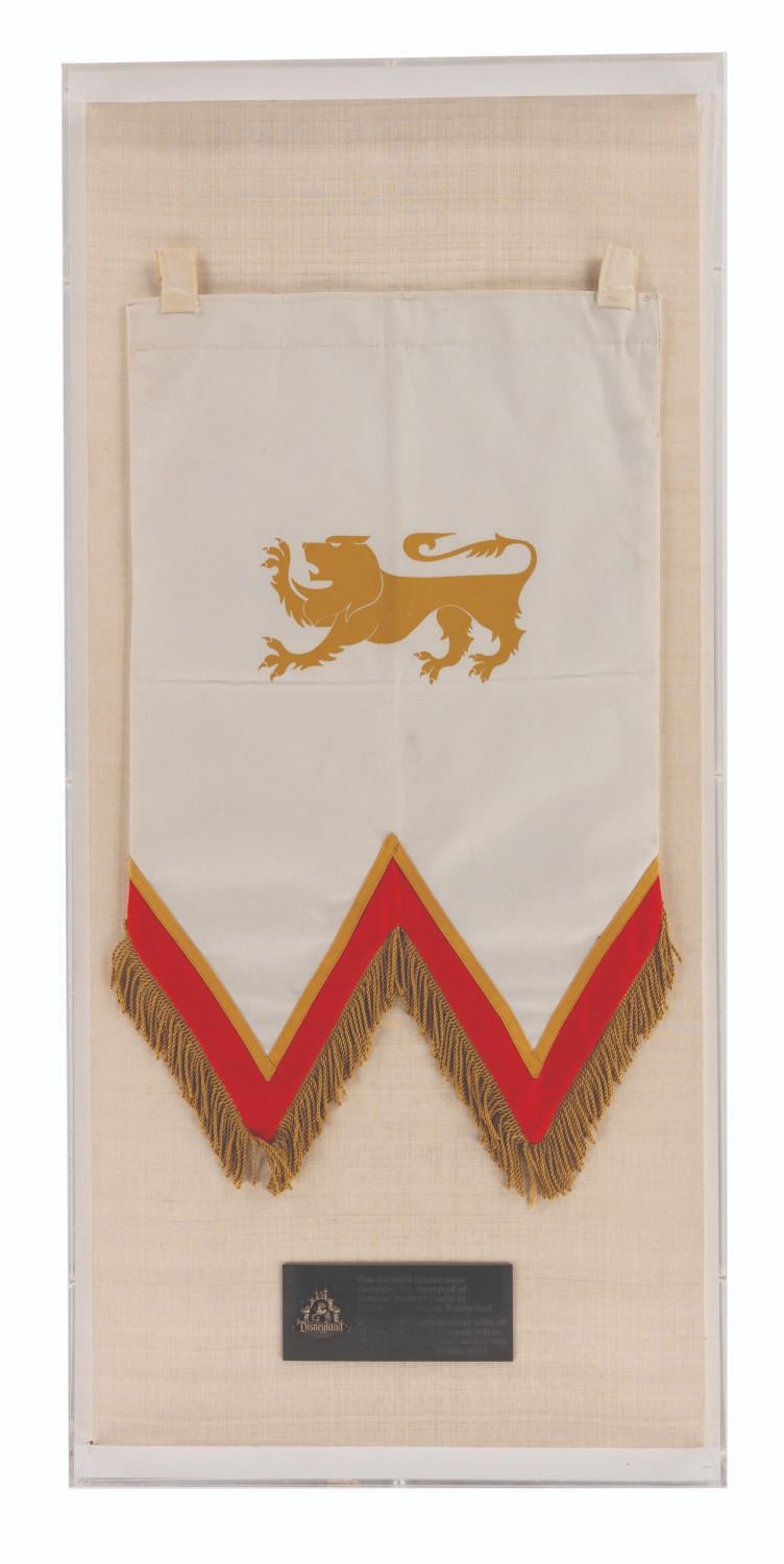 (Disneyland, 1970s) A regal lion banner from the original Sleeping Beauty Castle Courtyard area of Fantasyland at Disneyland. This large, fringed banner was removed for the New Fantasyland redesign in 1983. Measuring 14"x25", this banner is in very good Park-used condition with minor creases and wear from exterior display. The entire piece has been mounted along with a plaque, within a display measuring 16.5"x35.5"x3" and is in very good condition with minor wear to the case.