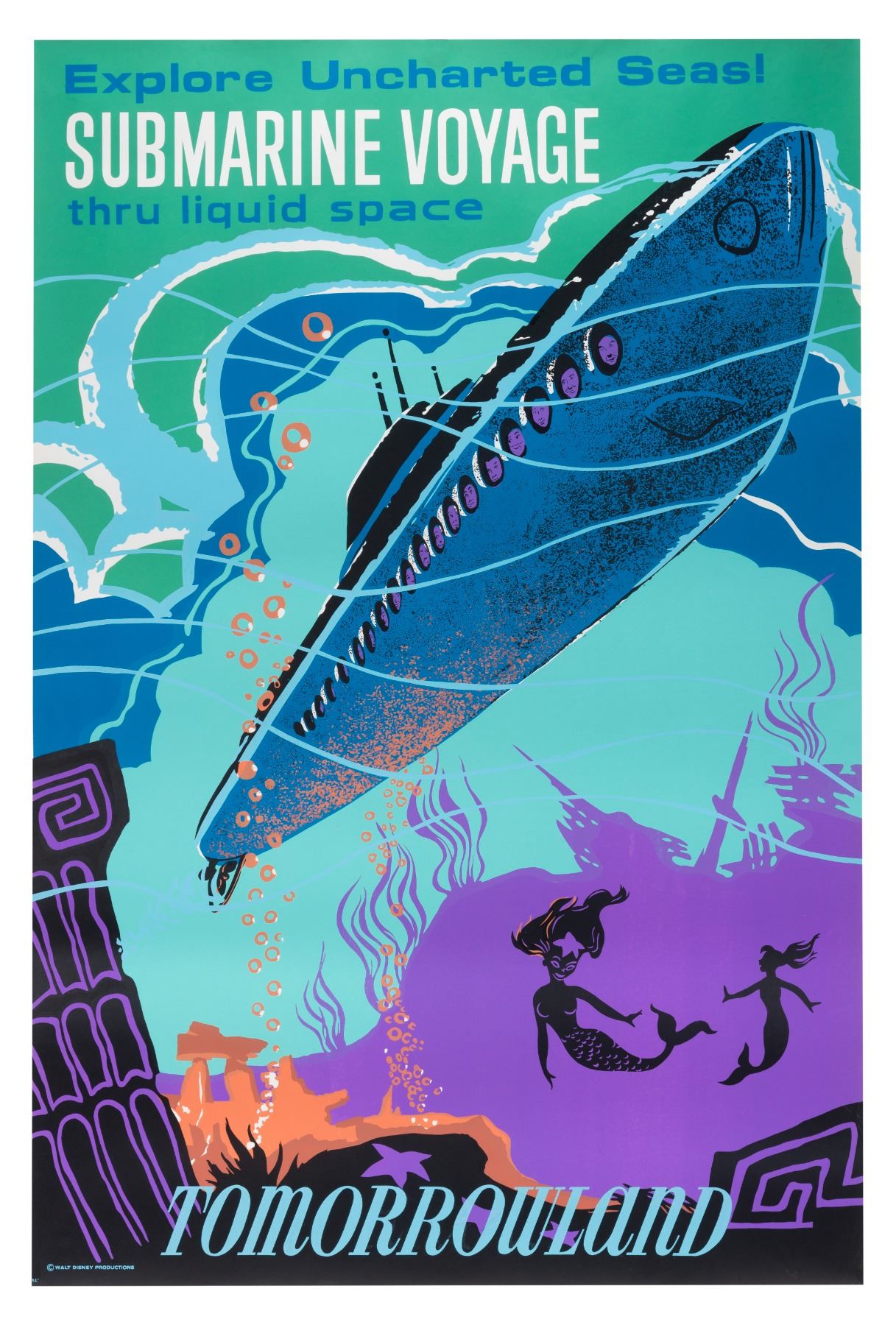 (Disneyland, 1959) A hand-silkscreened poster for the Submarine Voyage attraction. Designed by Sam McKim, this poster is a favorite among collectors for its stylized graphics and pleasing color palette. Measuring 36” x 54”, the poster is in very good condition with typical light edge wear, a very few scattered small scuffs and watermarks, and registration slightly towards the left leaving a thin strip of white on the right edge.
