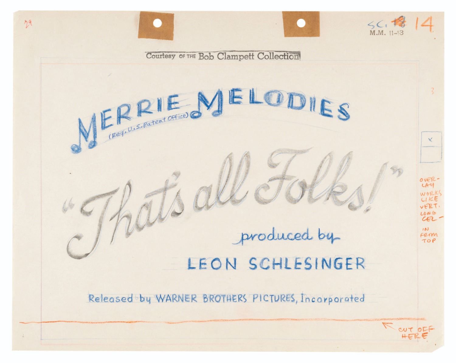 (Schlesinger, 1944) An unused original production layout of the “That’s All Folks!” text from the Merrie Melodies short, “The Old Grey Hare” directed by Bob Clampett. Updates were regularly made to the Looney Tunes and Merrie Melodies opening and closing cards. This layout was altered as Leon Schlesinger sold his studio and its characters to Warner Bros. during this film’s production, and his credit as producer was changed to Warner Bros. Cartoons, Inc. No other three words are as synonymous with the Golden Age of Animation as “That’s all Folks!” Accomplished in graphite and colored pencil and measuring 9.5” x 12”, the drawing displays in very good condition, stamped “Courtesy of the Bob Clampett Collection,” with light edge wear and pinholes from production use and light discoloration from age.