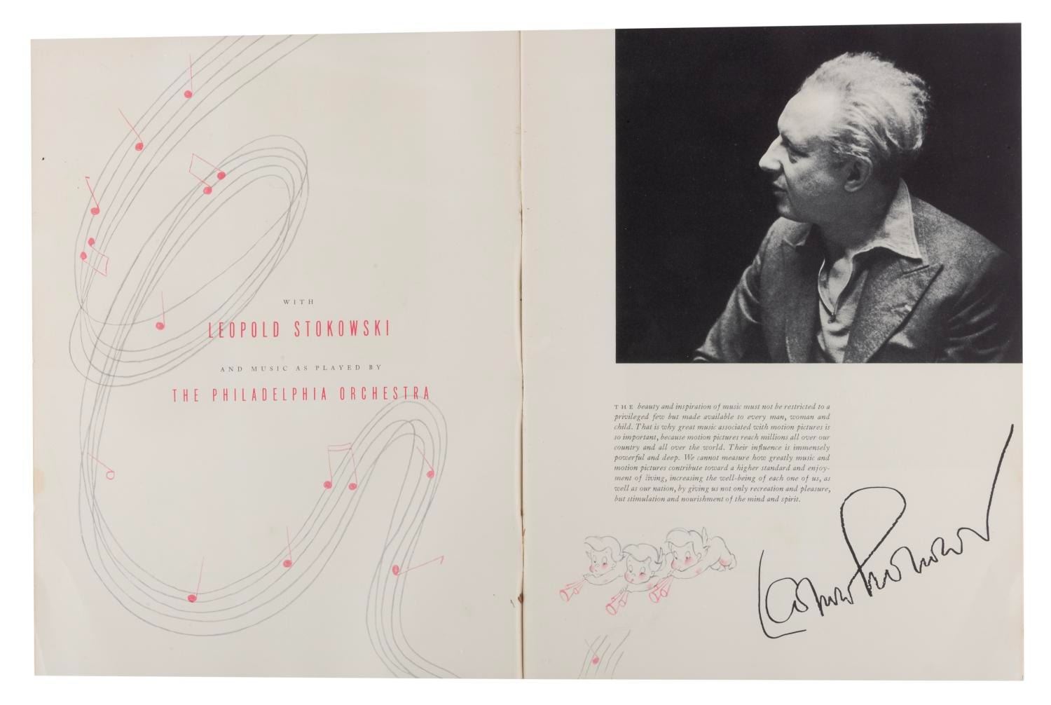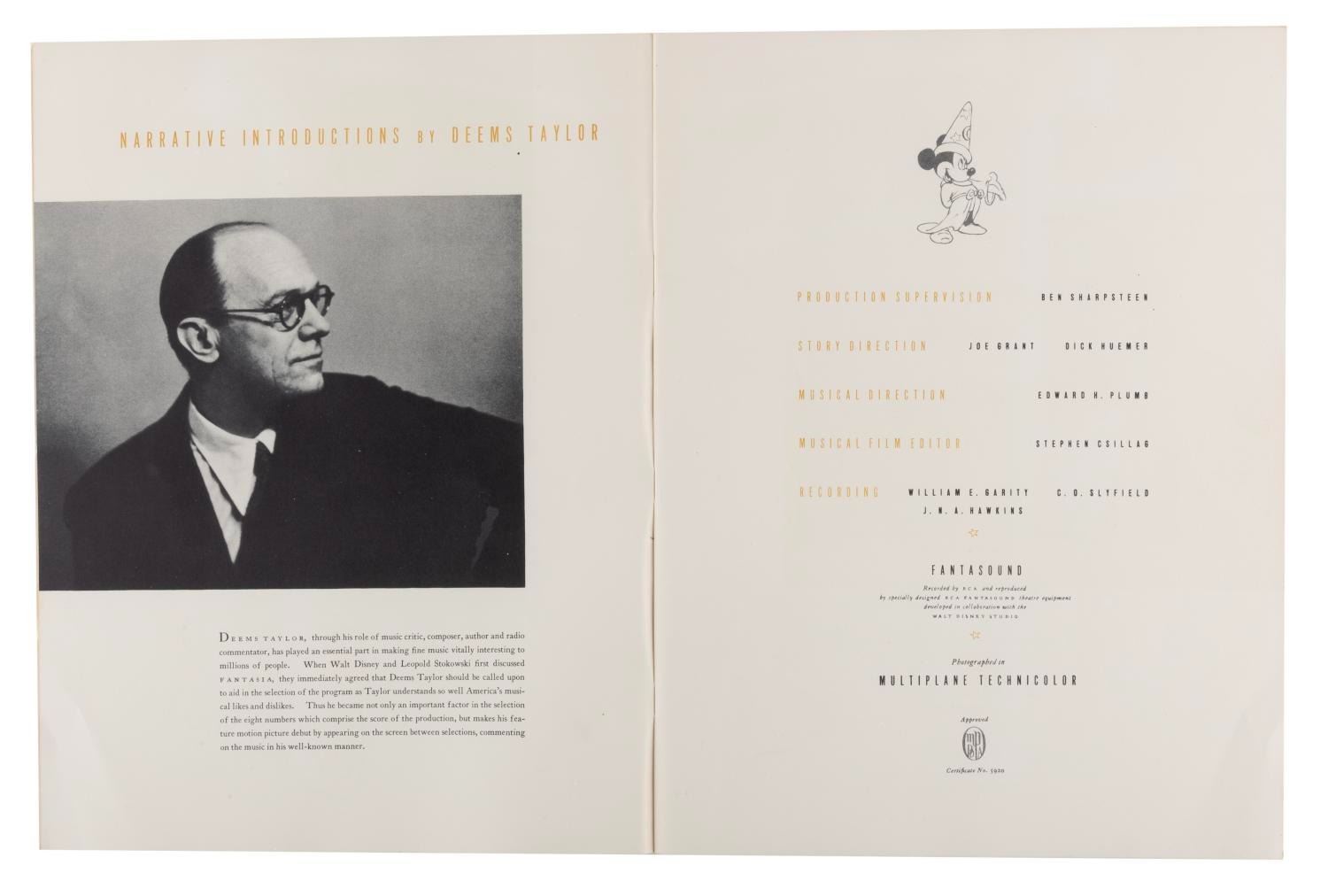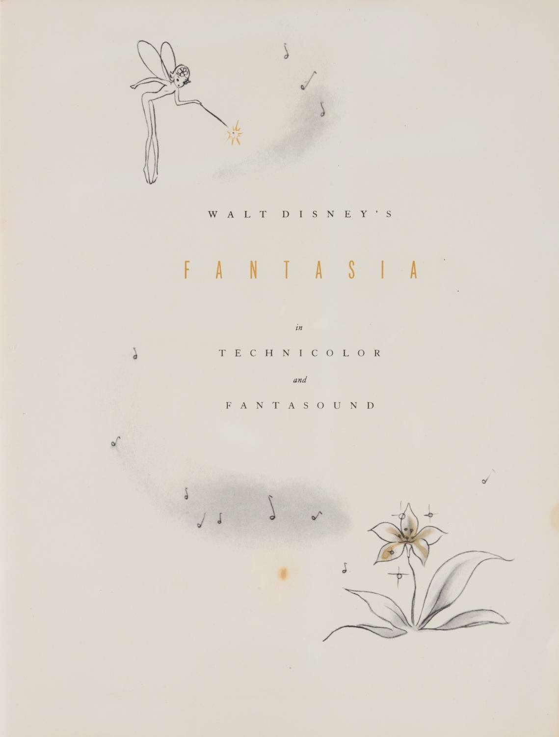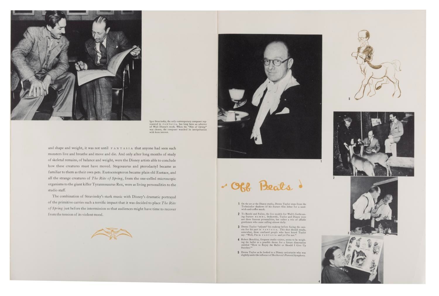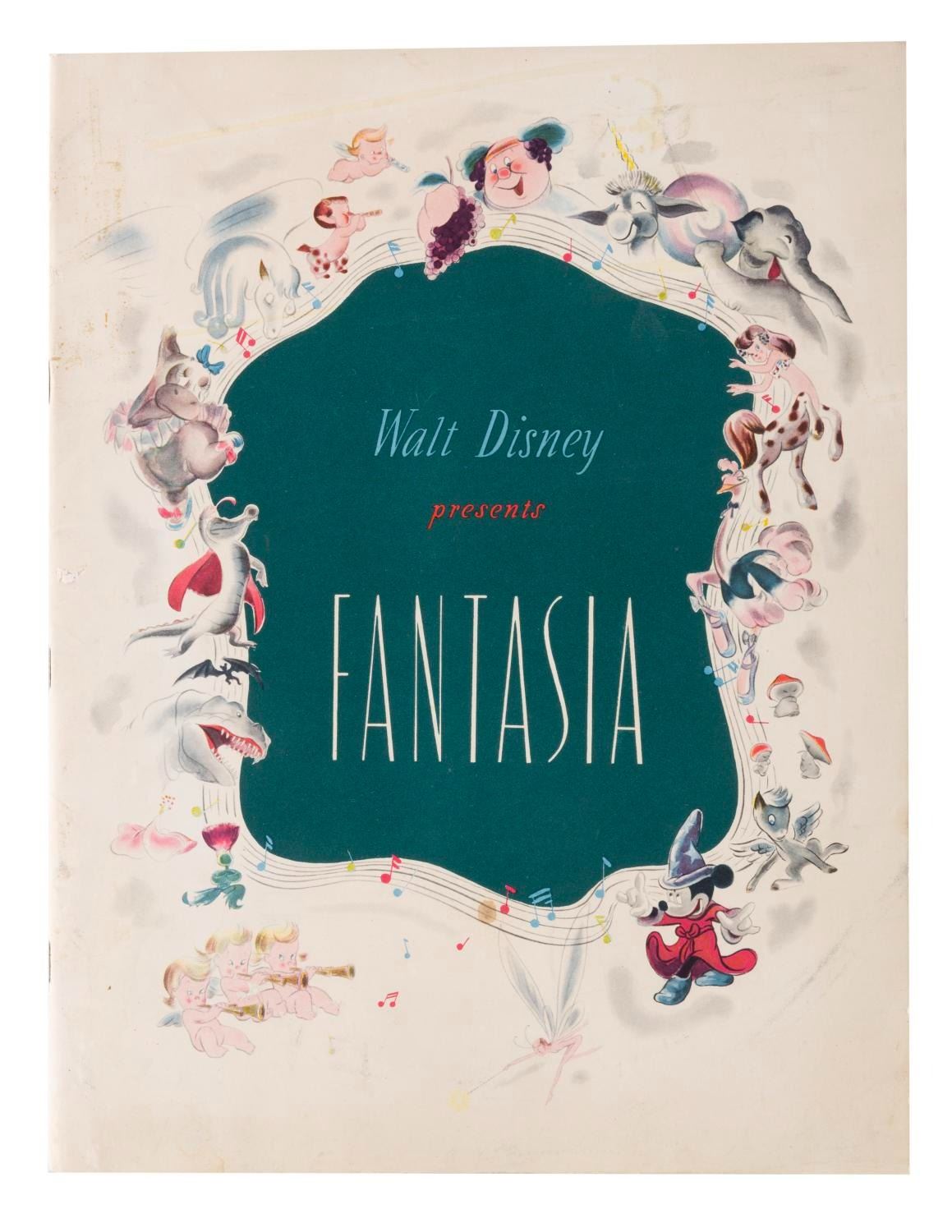 (Disney, 1940) An original “Fantasia" program created for the film’s initial theatrical release. The 28-page program features extensive behind-the-scenes information and background notes on each of the film’s segments, and is illustrated throughout with exclusive set and Studio photography, as well as concept art from the film’s development. Measuring 9.5" x 12.5", the program is in good condition with light edge wear, and small scuffs and stains to the front cover.
