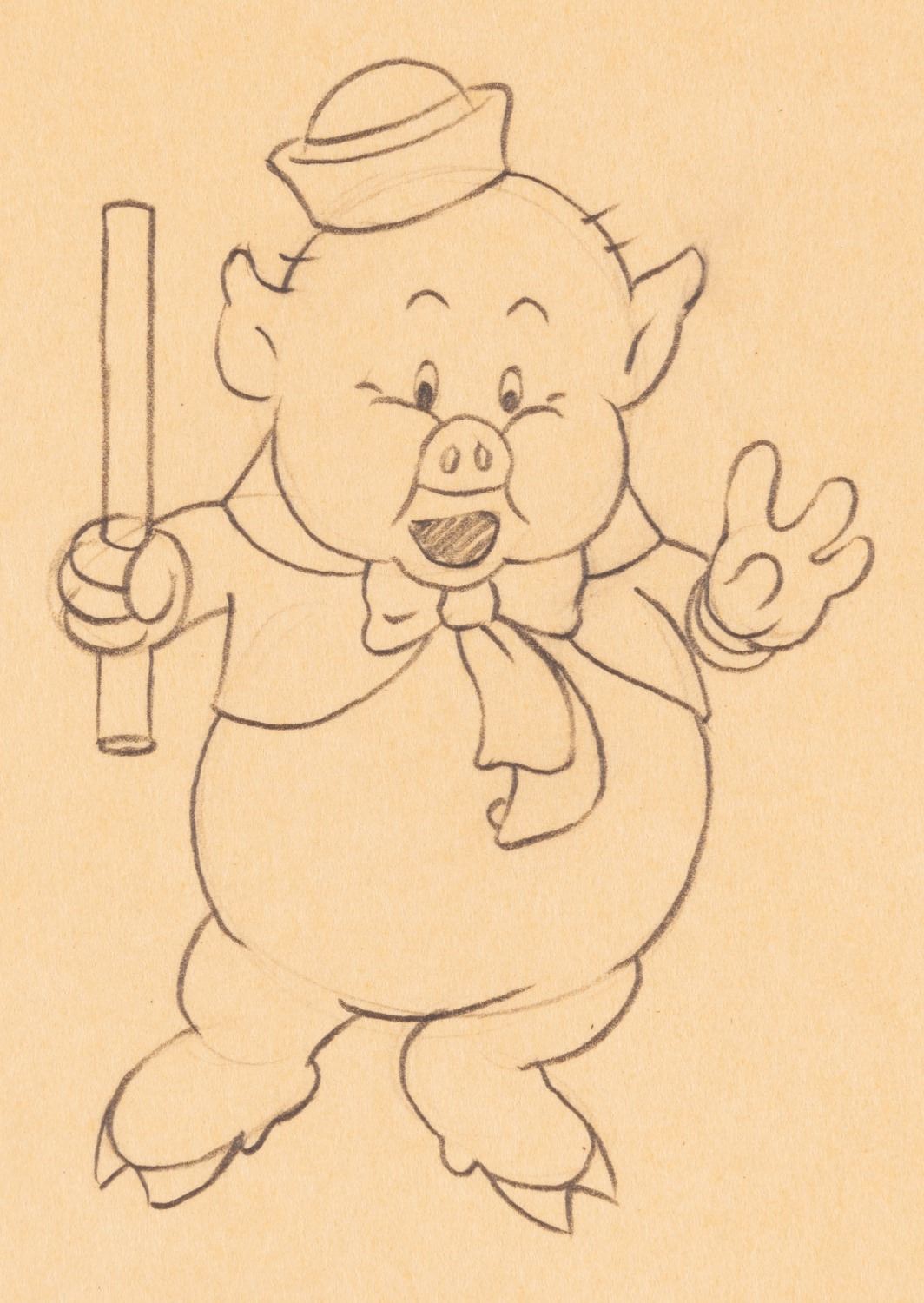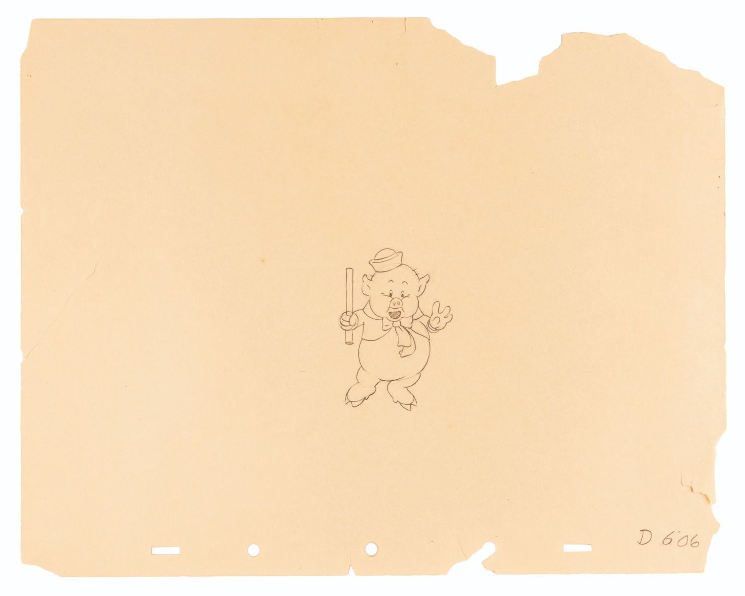 (Disney, 1933) An original production drawing of Fifer Pig from the Silly Symphony short “Three Little Pigs.” It is difficult to appreciate from today’s perspective how big a cultural phenomenon “The Three Little Pigs” was when that Silly Symphony cartoon was first released in 1933. The cartoon was so popular that Pig and Wolf merchandise filled the stores, and theaters displayed cutouts of the Pigs out front with beards that grew longer for each week the cartoon played. With an image size of 2” x 2.75” on 9.5” x 12” animation paper, the graphite drawing is in good condition with discoloration from age and heavy edge wear and tears throughout, including a 2.25” tear on the left and a 1.5” x 5” section at the top right that is missing—none of which affect the image.