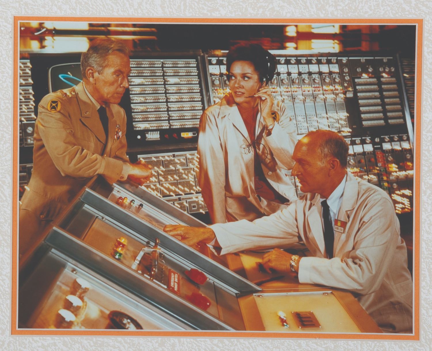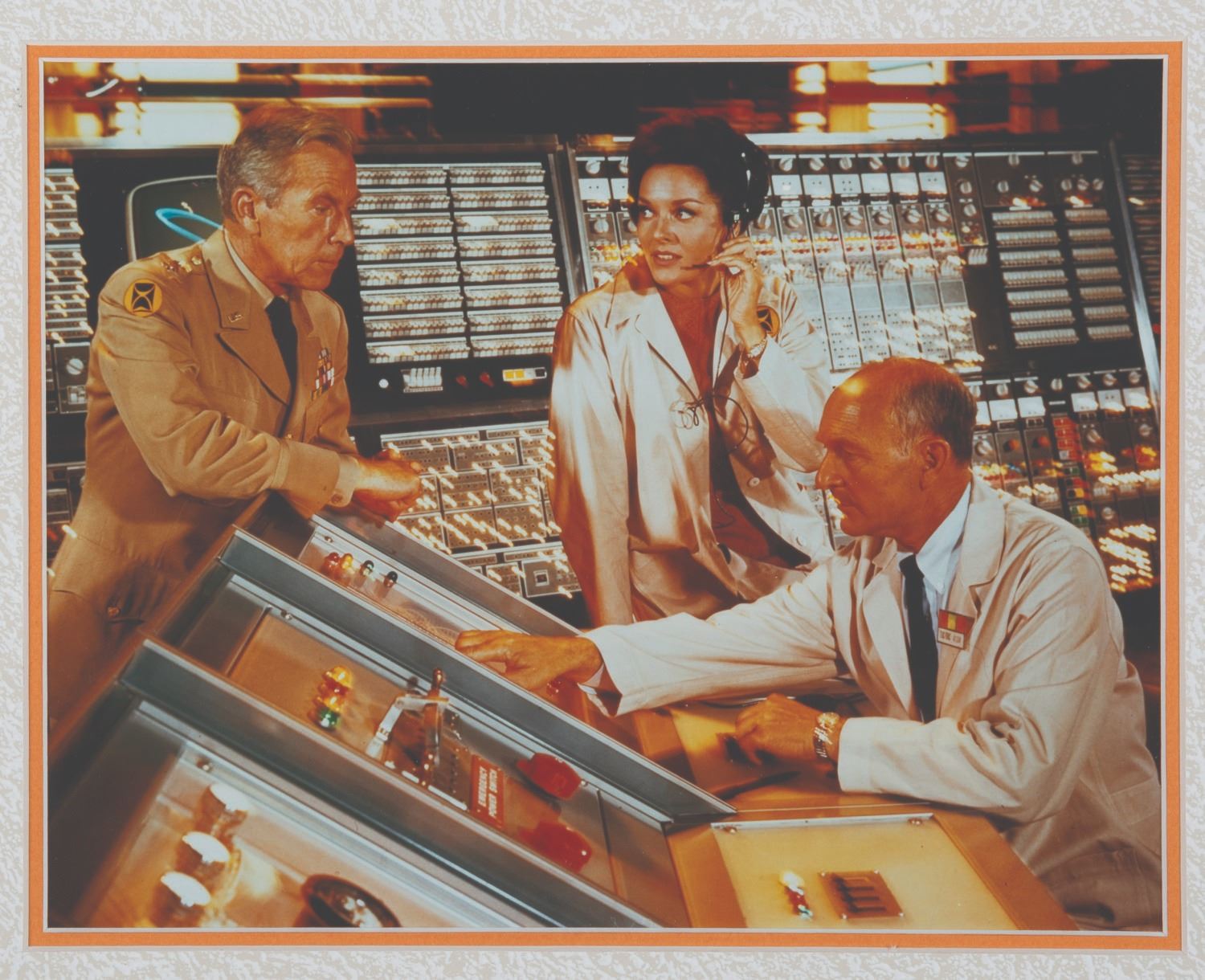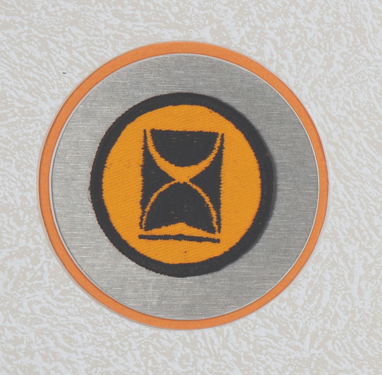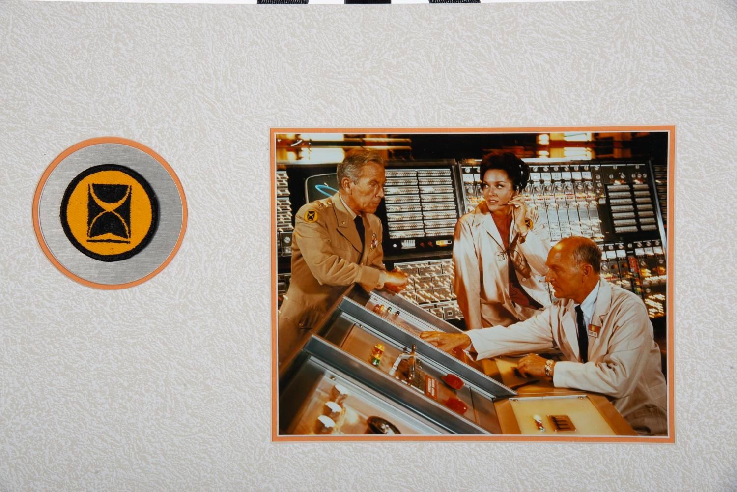 (20th Century Fox television, 1966) An original costume patch from Irwin Allen's"Time Tunnel" television series. Members of Project Tic Toc, the government project that created the Time Tunnel, wore this patch on their uniforms. The 2.25" patch comes matted with an 8"x10" publicity still showing actors Lee Meriwether and Whit Bissell wearing the patch. The patch is in very good production-used condition, and the entire 13.25"x20" piece is in fine condition.