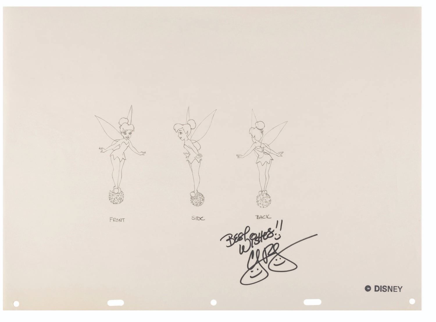 (Disney, 1990s) An original merchandise concept drawing of a Tinker Bell "waterglobe" figure, signed by the artist. The images of Tinker Bell have a total size of 8"x5" on untrimmed 17"x12.5" animation paper. The artwork is in very good condition exhibiting discoloration to the paper's edges and light wear from handling and age.