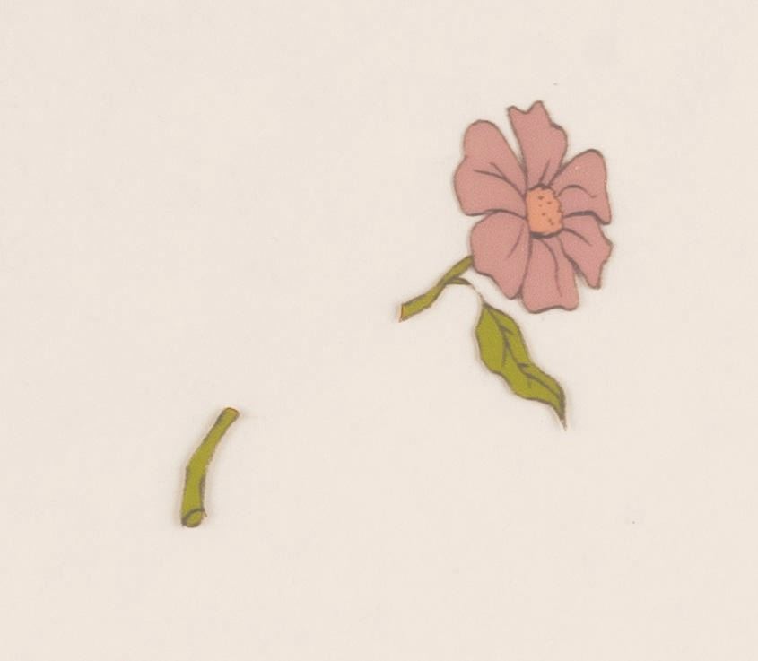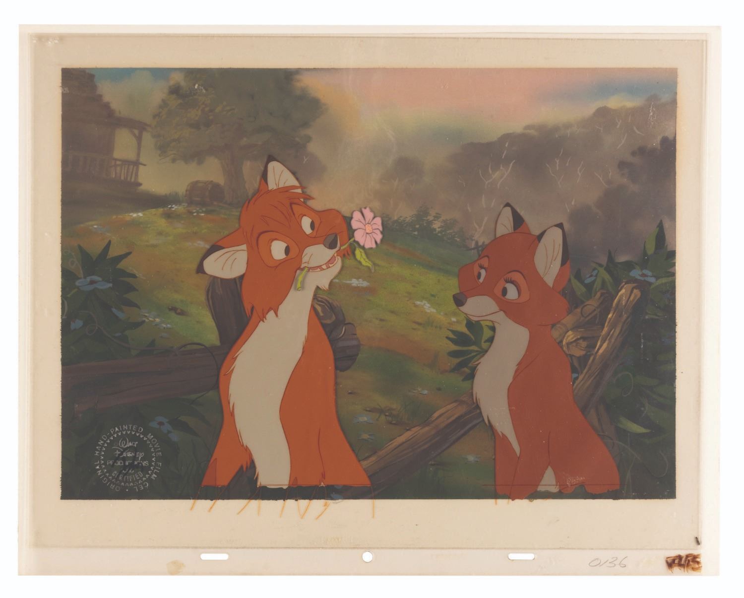 (Disney, 1981) An original multi-layered production cel of Tod and Vixey from Disney’s “The Fox and the Hound” paired with a preliminary production background. With character images of 4.5” x 7.5” and 4” x 6.5” on a 12.5” x 16” background, the piece is in very good to fine condition with light smudges, tape residue, and edge wear to the background.