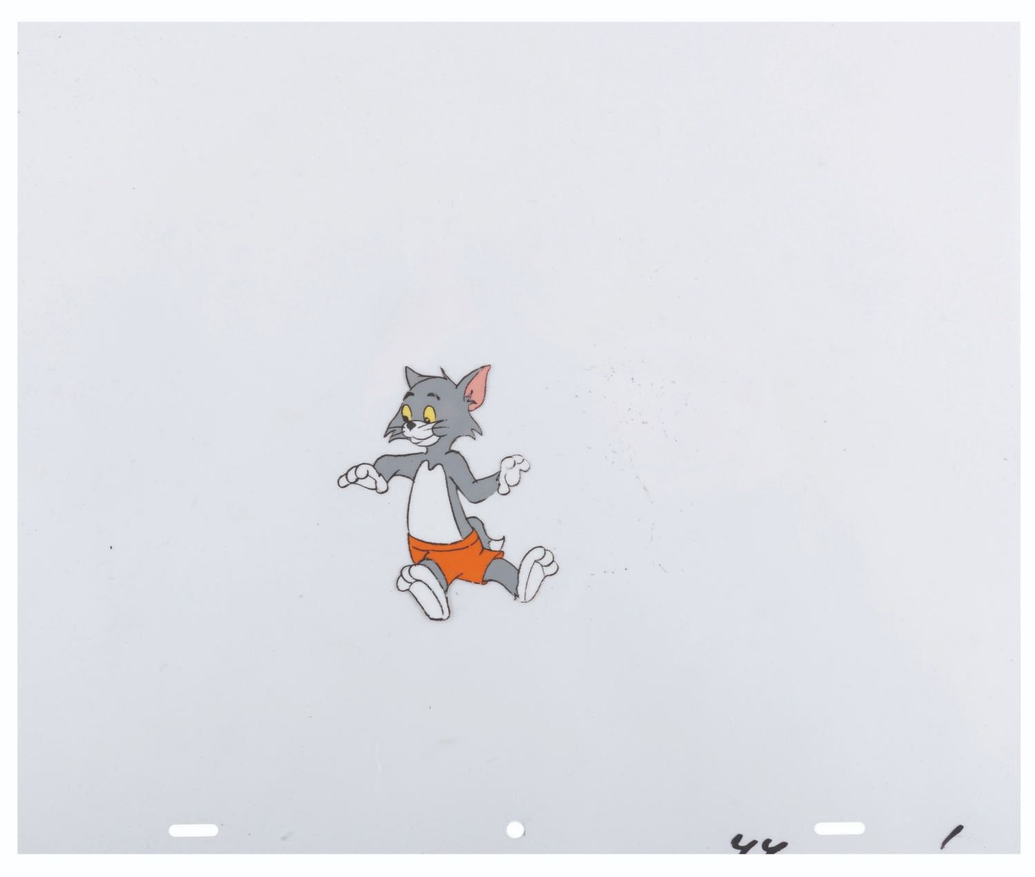 (Hanna Barbera, 1975) An original cel of Tom wearing a swimming suit from Hanna Barbera's "The Tom and Jerry Show." With a character size of 1.75" x 3.25" on a 10.5" x 12.5" untrimmed cel, the piece is in good condition with some loss to the black xerographic line throughout from age.