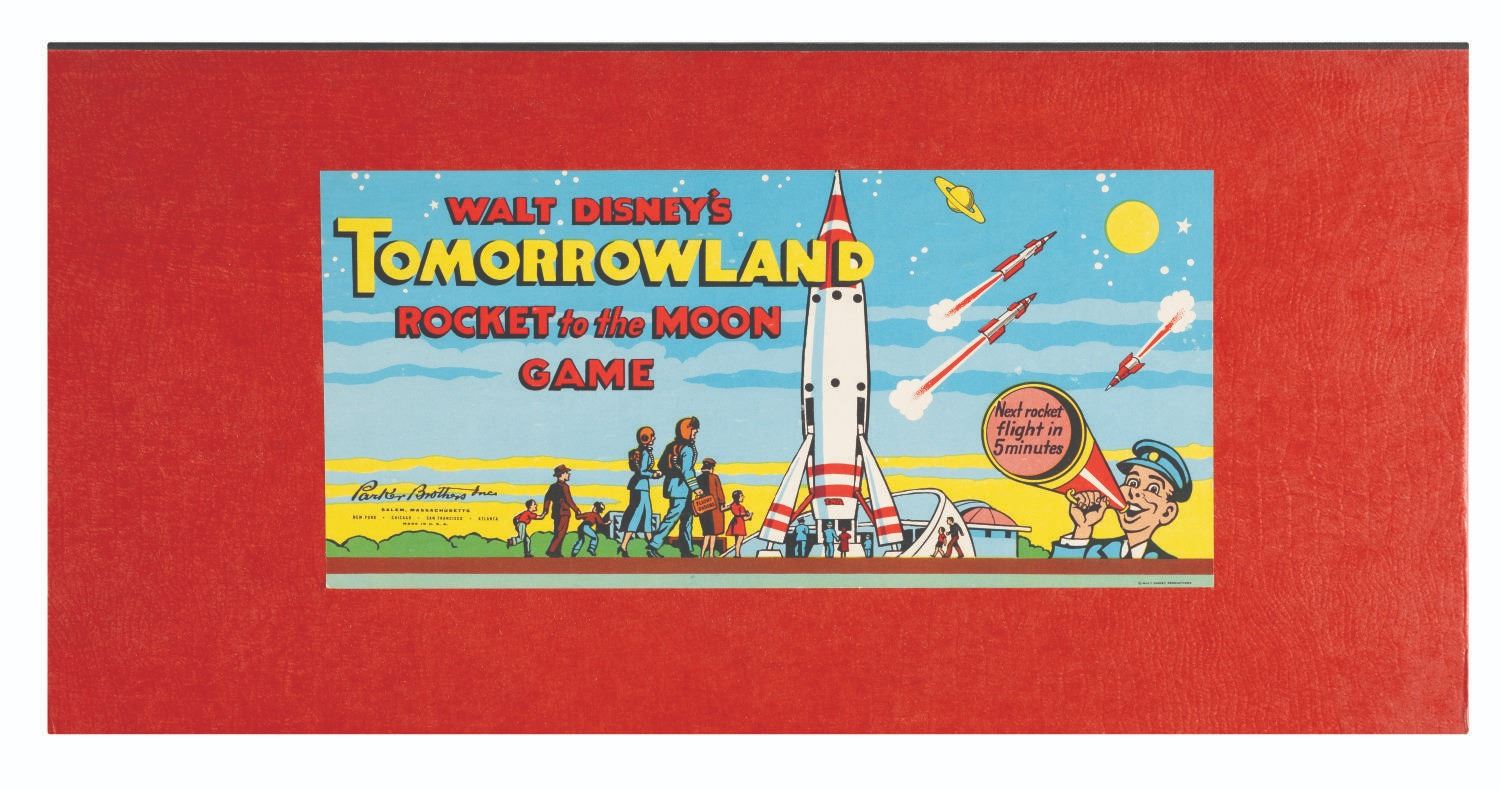 (Disneyland, 1956) A complete "Tomorrowland Rocket to the Moon Game" in its original box. The game includes a game board, 4 color markers, and a spinner. The box measures 7.75"x16" and 1.75" tall and the game is in good condition exhibiting creases and tape to the box lid, fading, and wear.