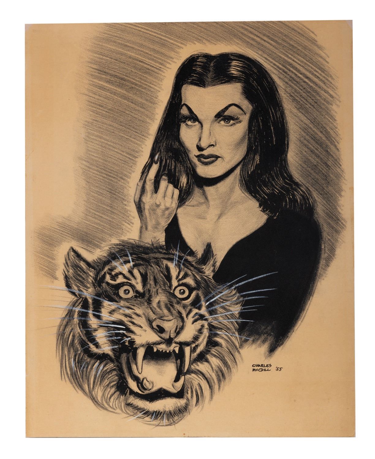 (Charlie McGill, 1955) An original portrait of Maila Nurmi, the 1950s TV horror hostess and star of Ed Wood's "Plan Nine from Outer Space. Nurmi is showcased in her guise as the sultry "Vampira" alongside a tiger. Artist McGill, best known for his sports cartoons and over 4,000 portraits of athletes, stepped outside of his typical subject matter for this piece. Signed "Charles" instead of his usual "Charlie," this 1955 portrait predates McGill's stated first art sale by a year. Accomplished in ink on coquille paper, the 17.5"x13.25" art is in fine condition, with slight wear to edges from age.