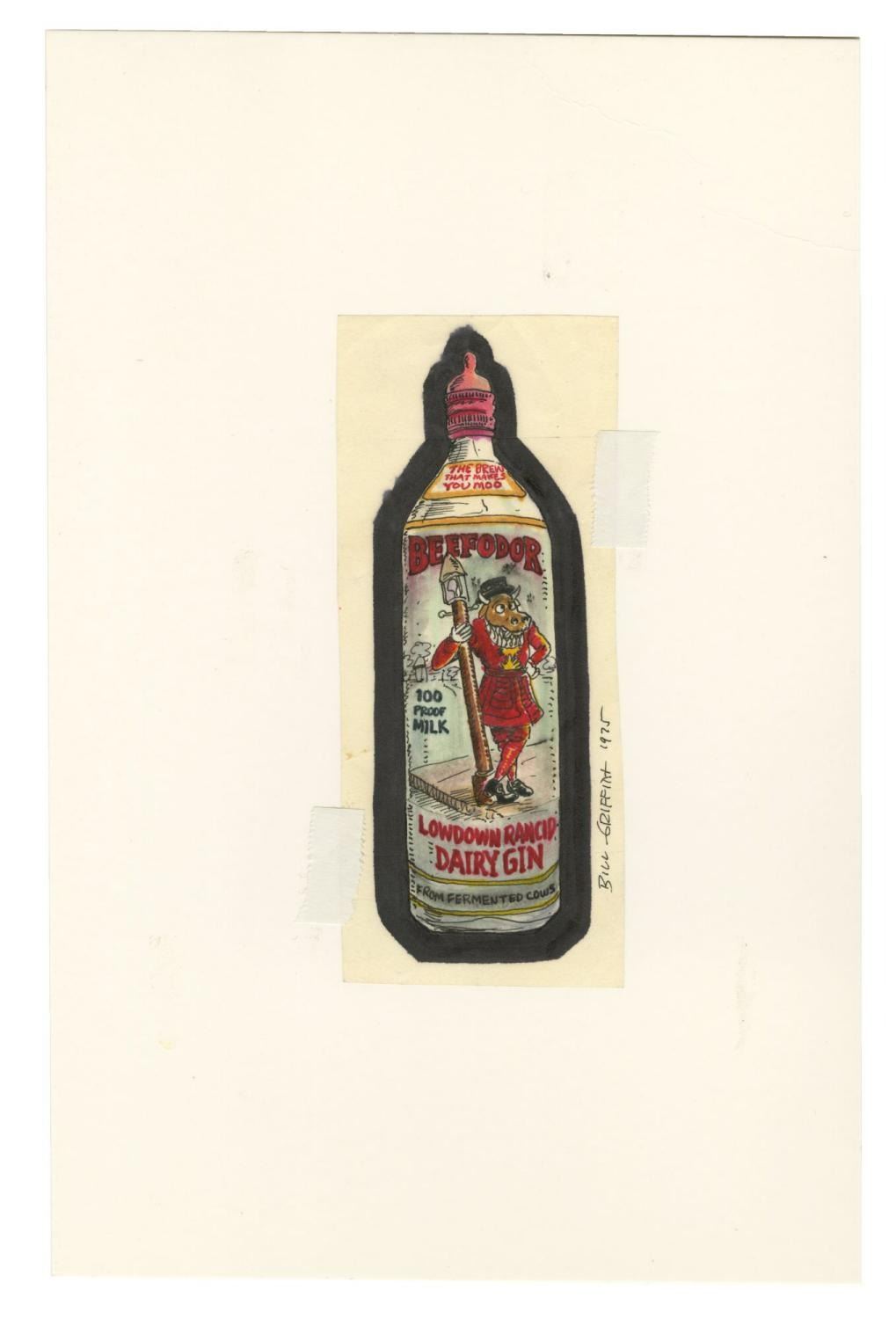 (Topps, 1975) An incredibly rare, unpublished design for Topps' Wacky Packages line of trading cards and stickers. The design, titled "Beefodor", was a parody of Beefeater dry gin and was illustrated by Bill Griffith, creator of the popular comic strip "Zippy." The original artwork is accomplished in marker on paper, and signed by Griffith on the right-edge. The illustration has been trimmed to image measuring 2.5” x 5.75" and taped to a 7” x 10.5” piece of cardstock. The artwork is in very good condition with light creasing and stains on the left edge which do not affect the image.