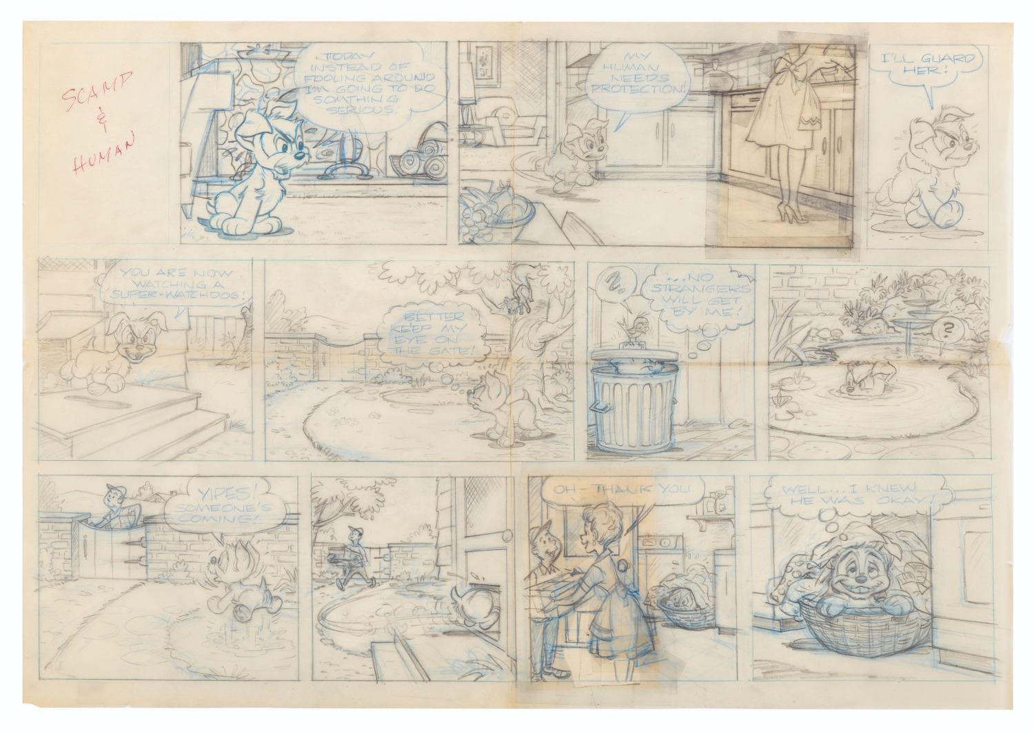 (Disney, 1956-88) The original drawing for a"Walt Disney’s Scamp" Sunday comic strip titled"Scamp & Human." The comic is comprised of multiple pieces of paper clipped and arranged together, with panels removed and replaced from edits in production. Accomplished in graphite and colored pencil on tracing paper, measuring 16" x 23", the comic artwork is in good condition with discoloration, moderate edge wear, a three-inch tear to the left edge, and heavy fold lines from storage.