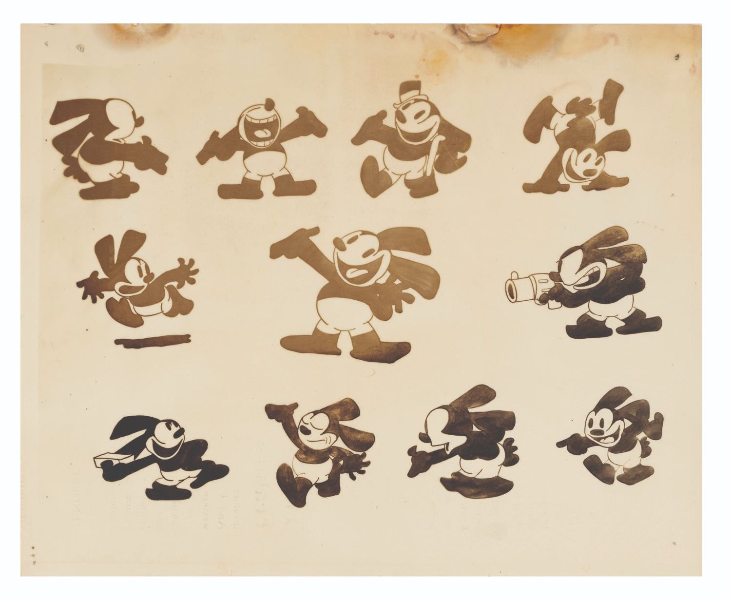 (Disney, 1920s) A rare 1920s Oswald the Rabbit model sheet from Bob Clampett’s personal collection. Model sheets such as these were distributed to animators and crew working on the film to ensure character design continuity. The 8” x 10” photo print is in fair condition with pinholes, discoloration, and heavy toning along the top edge and a slight tear at the top right edge that does not affect the image.