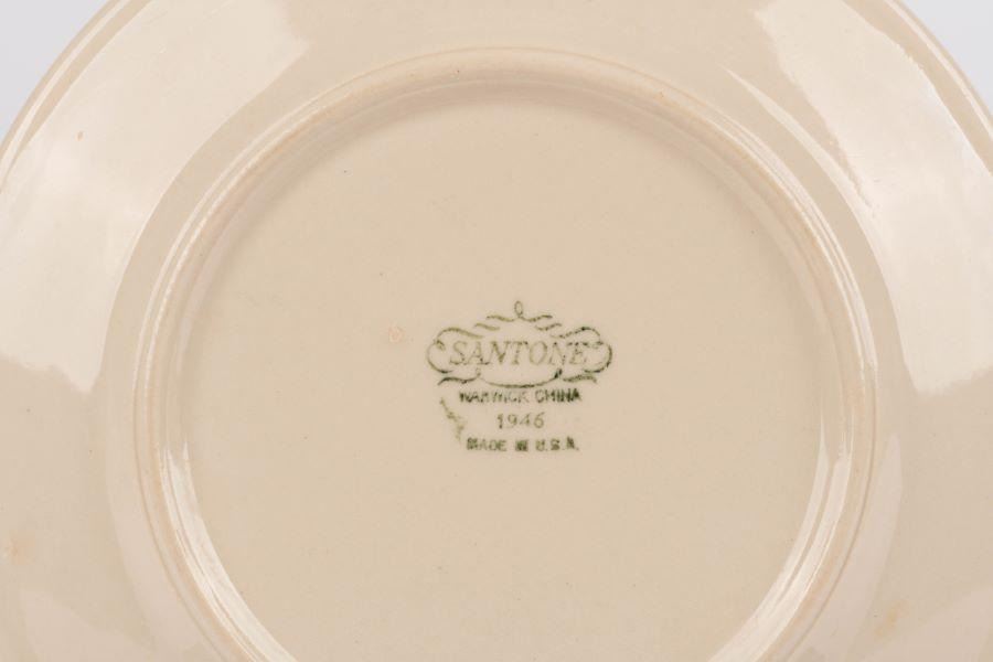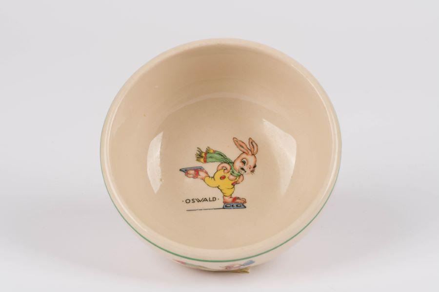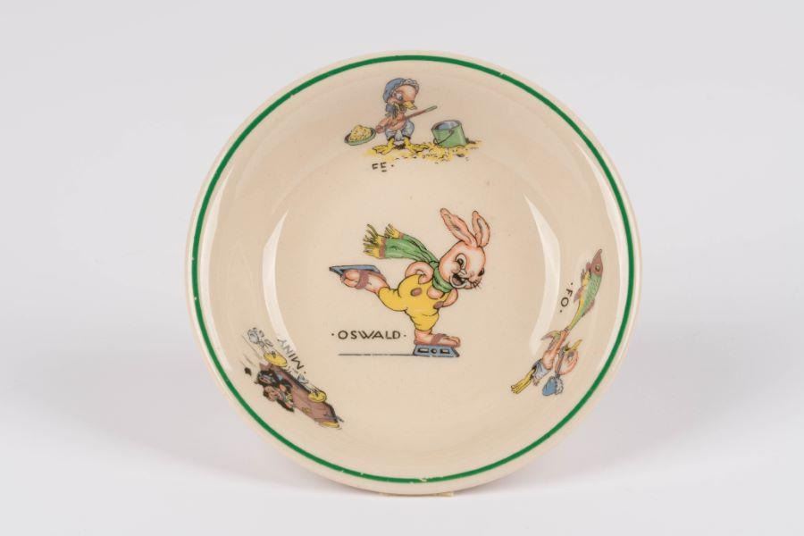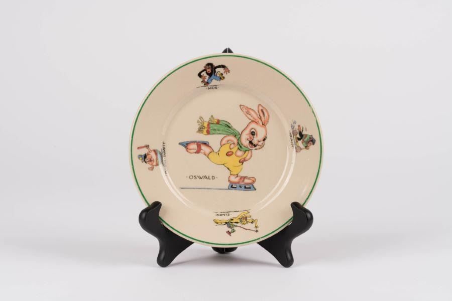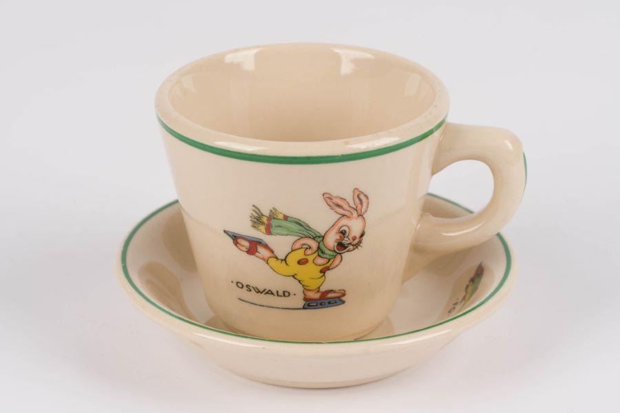 (Warwick China, 1946) A ceramic dish set featuring a post-Disney version of Oswald the rabbit by Universal Pictures. The set includes a plate, a bowl, a cup, and a saucer. The 7" in diameter plate, the 5" diameter bowl, the 4" x 3" and 3" tall cup, and the 4.75" in diameter saucer are in very good condition with small spots of wear, some scratches to the imagery and price labels on the bottom from previous sale.
