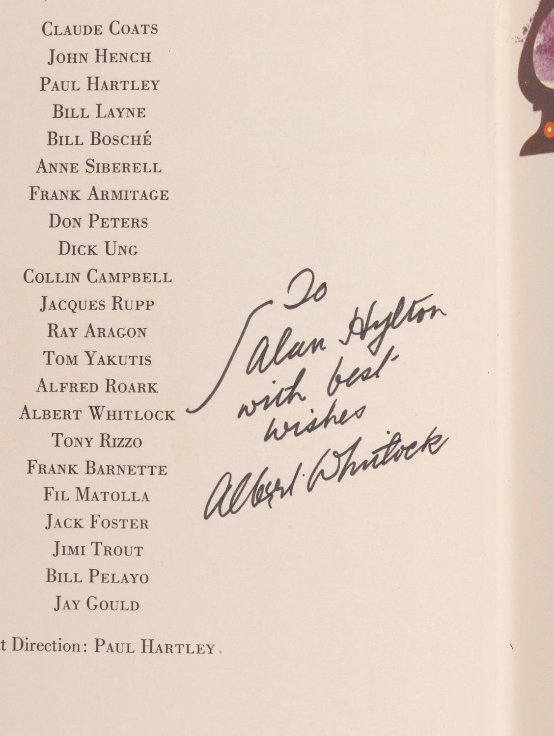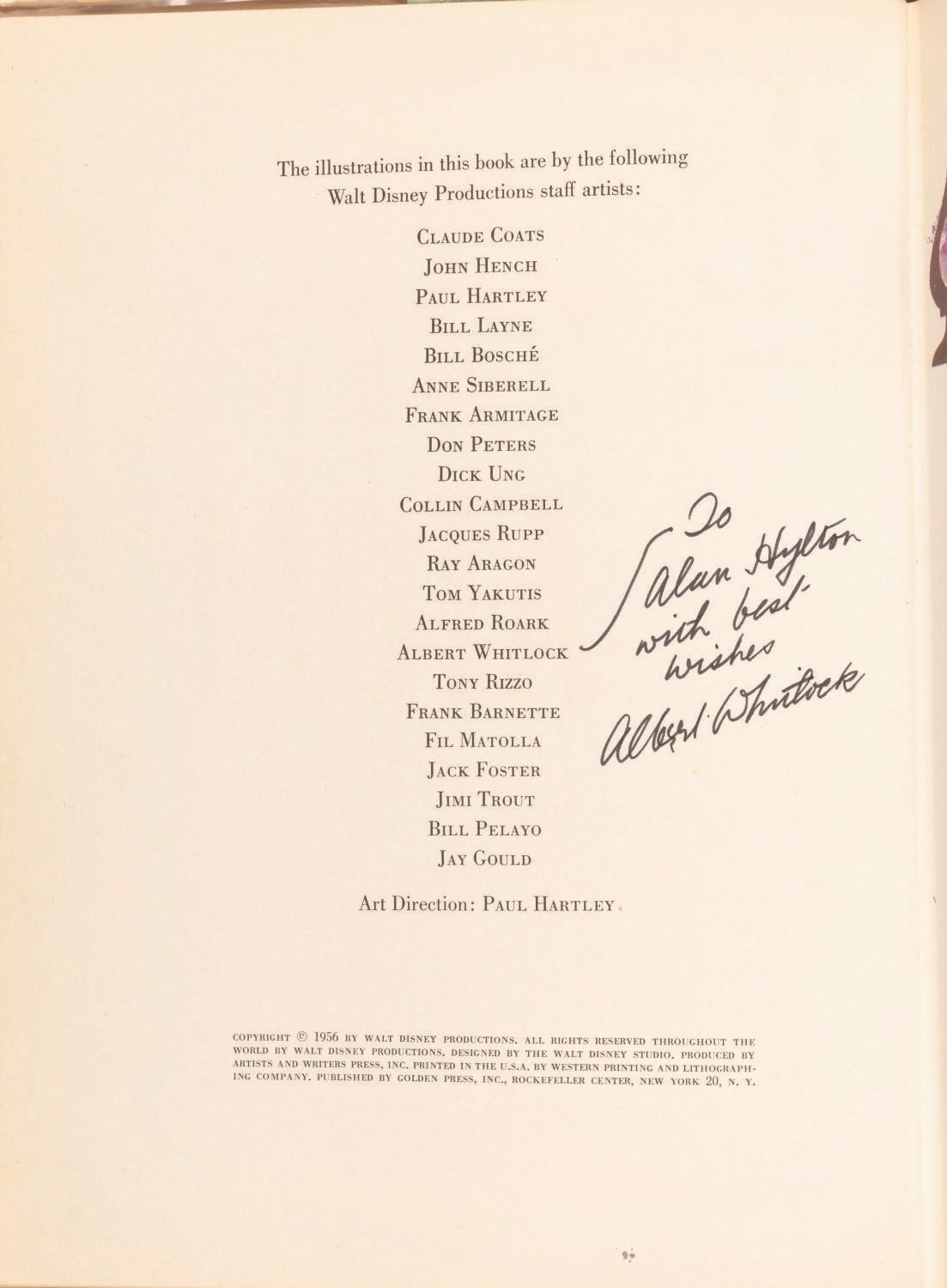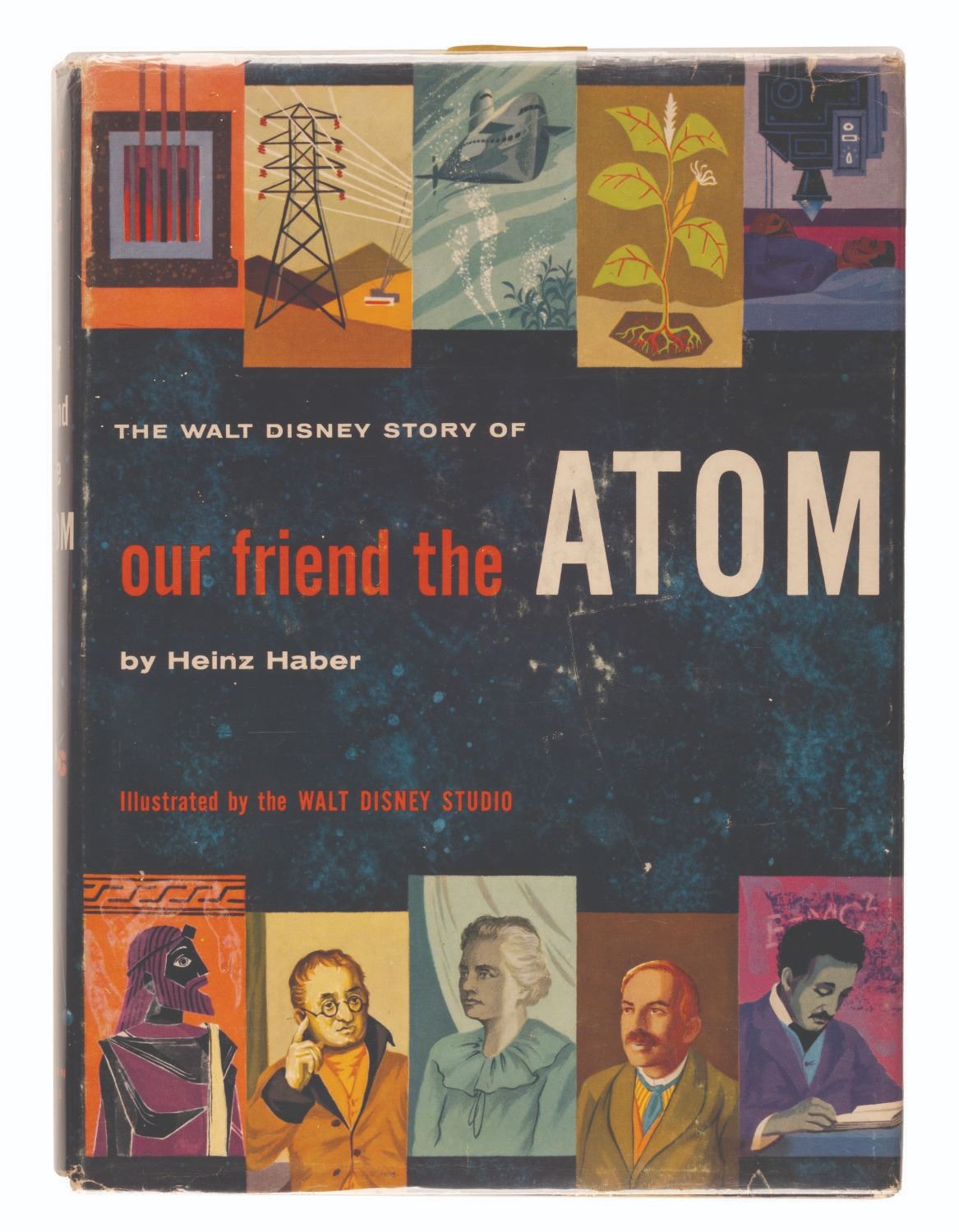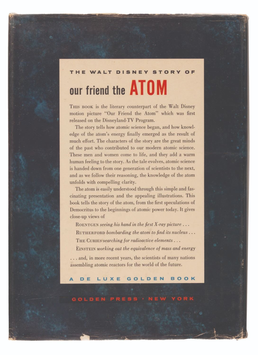 (Golden Press, 1956) A hardcover book titled Our Friend the Atom, signed by Disney artist Albert Whitlock with a dedication. Measuring 8.25" x 11.25", the 165-page book is in very good condition with light wear overall. The dust jacket is in good condition with smudges, edge wear, a 1" x 1" piece missing from the inside flap, and tape repairs.