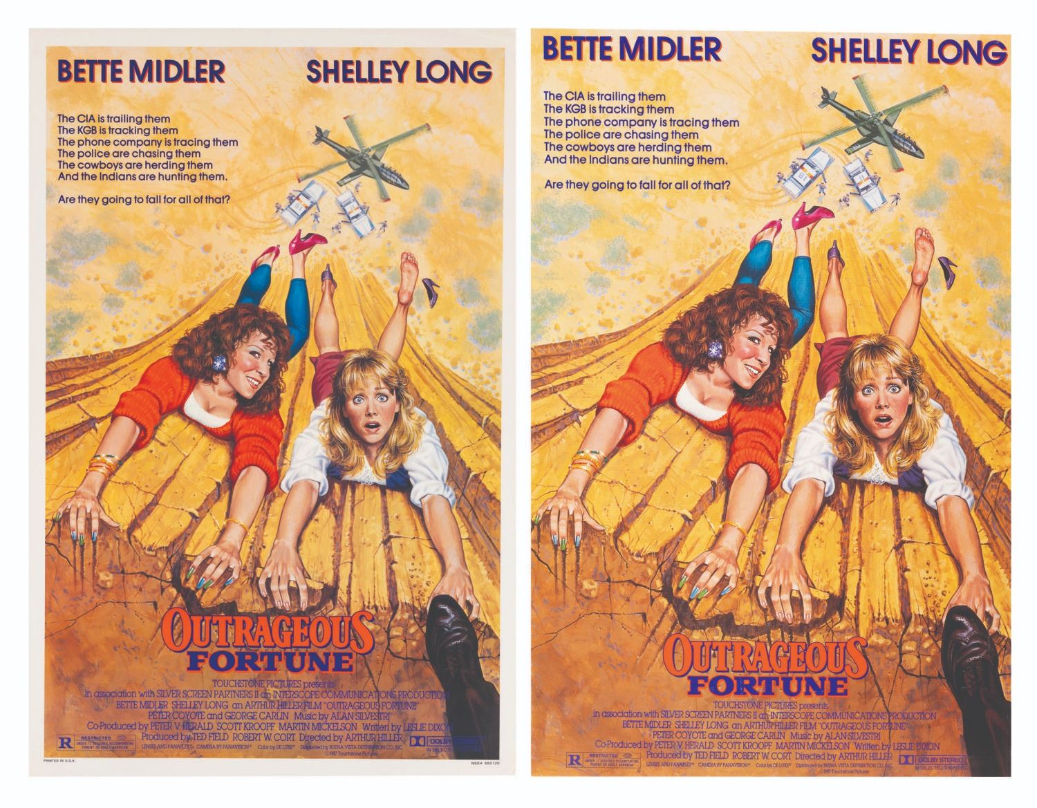 (Buena Vista, 1987) An original theatrical poster and counter display for the Bette Midler and Shelley Long comedy "Outrageous Fortune.” Middler and Long were both promised top billing on the film’s poster and neither would relent. As a solution, Long was given top billing on posters displayed West of the Mississippi, and Midler was given top billing on posters East of the Mississippi, such as this one. The poster measures 27” x 41” and the counter display is 9.25” x 14”, both in very good condition with light creases and edge wear.