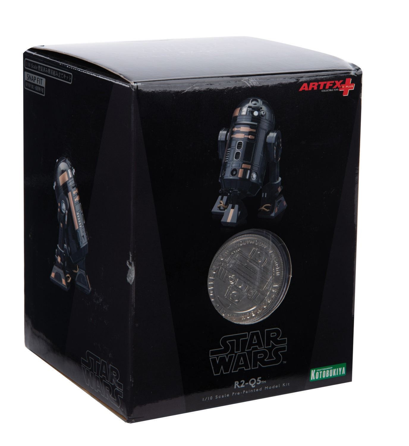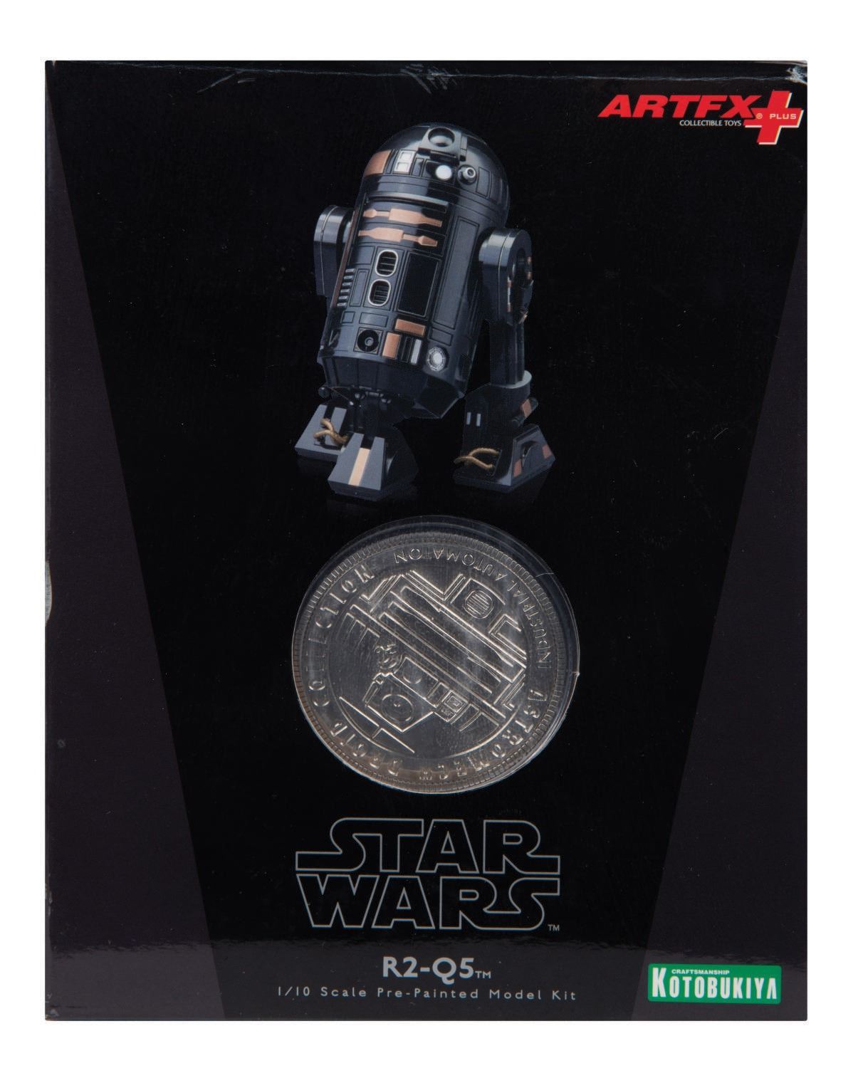 (Lucasfilm/ArtFX/Kotobukiya, 2013) A rare, 1/10 scale pre-painted model of R2-Q5, produced by Kotobukiya and ArtFX. This variant on the R2-D2 model was only available at the New York City Comic Con in 2013. The unassembled model remains within its 7"x5.5"x5.5" original box and packaging, in very fine condition. The box is in good condition, with scuffs to some edges.