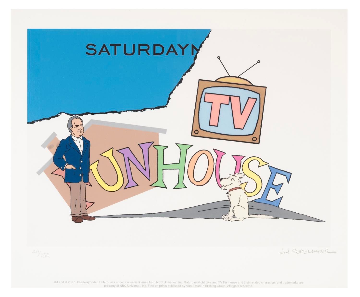 (SNL, 2007) A limited edition giclee print featuring the title card of the J.J. Sedelmaier Studios “TV Funhouse” shorts from “Saturday Night Live.” The limited edition print is hand-numbered 20 of an edition of only 150 and was signed by Sedelmaier in graphite in the bottom right corner at San Diego Comic Con in 2007. Measuring 10” x 12”, the print is in fine condition.