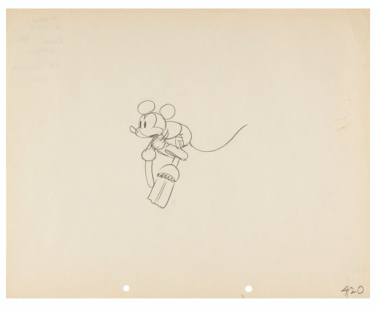 (Disney, 1929) An exceptional original production drawing by Ub Iwerks of Mickey Mouse from the character’s 4th animated short “The Barn Dance.” With a character image size of 4” x 3.5” on untrimmed 12” x 9.5” animation paper, the graphite drawing is in very good condition with light wear from age. From the collection of Bob Clampett.