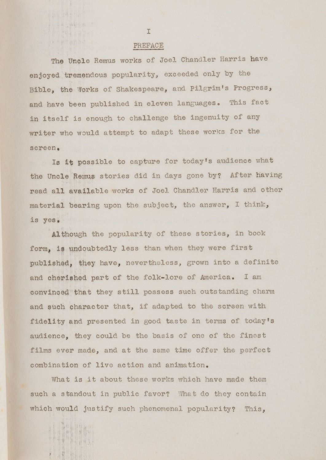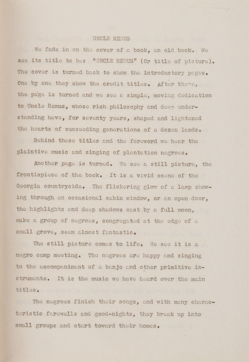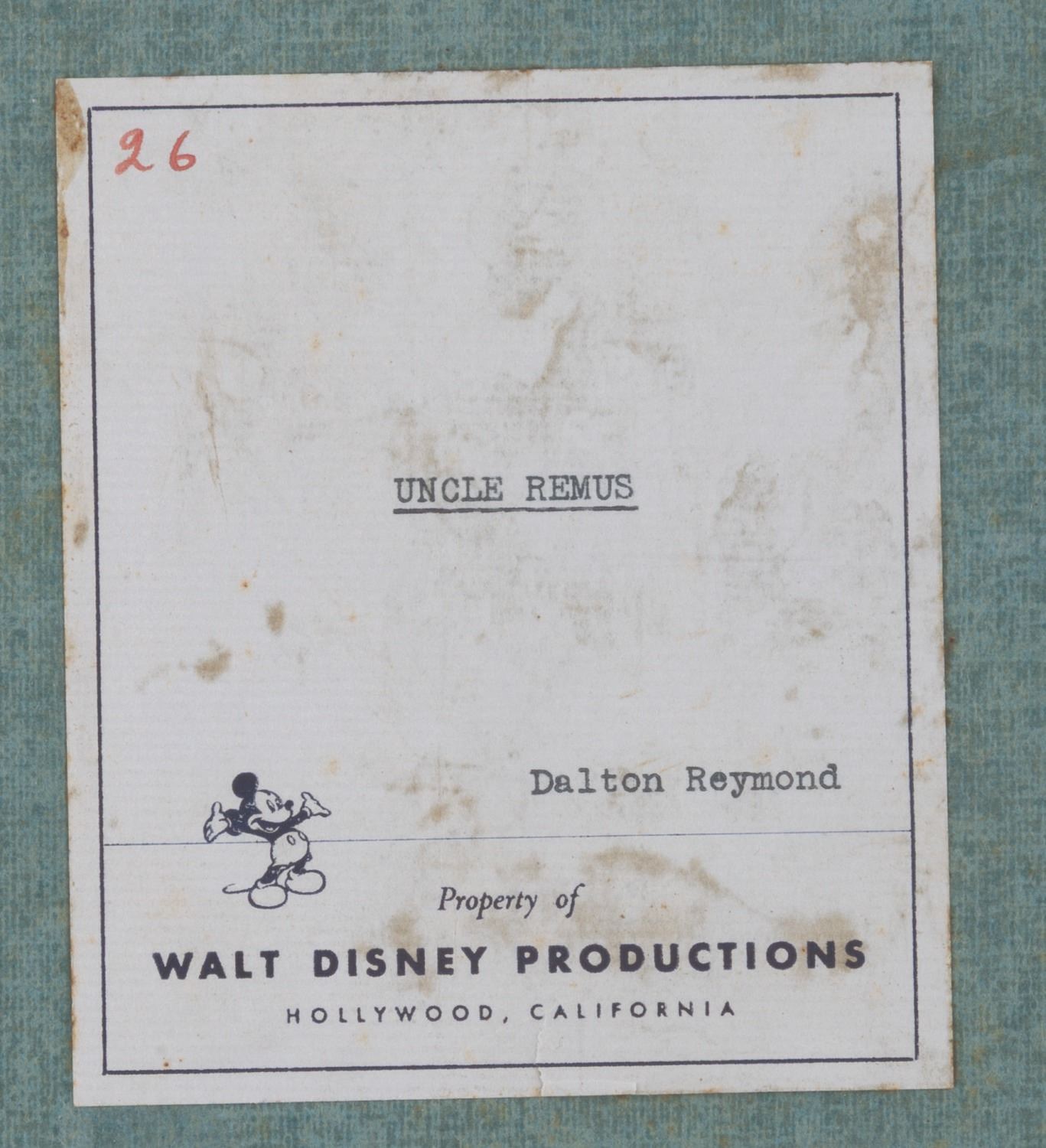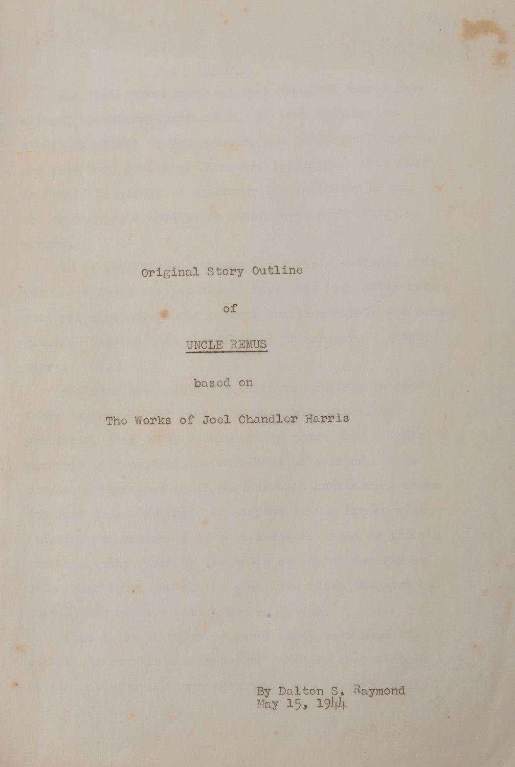 (Disney, 1944) An original story outline by Dalton Reymond for “Song of the South.” Reymond helped to bring the beloved characters of Joel Chandler Harris’ writing to the screen with this treatment of “Uncle Remus,” which became “Song of the South.” Measuring 9” x 11.5” the outline is in good condition with soiling, creasing and chipped corners from production use and age.