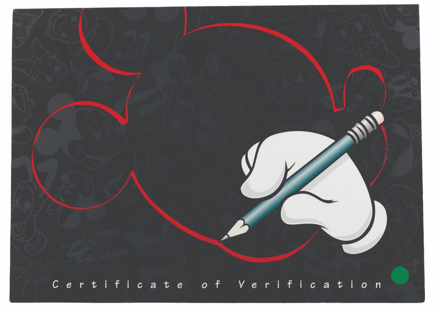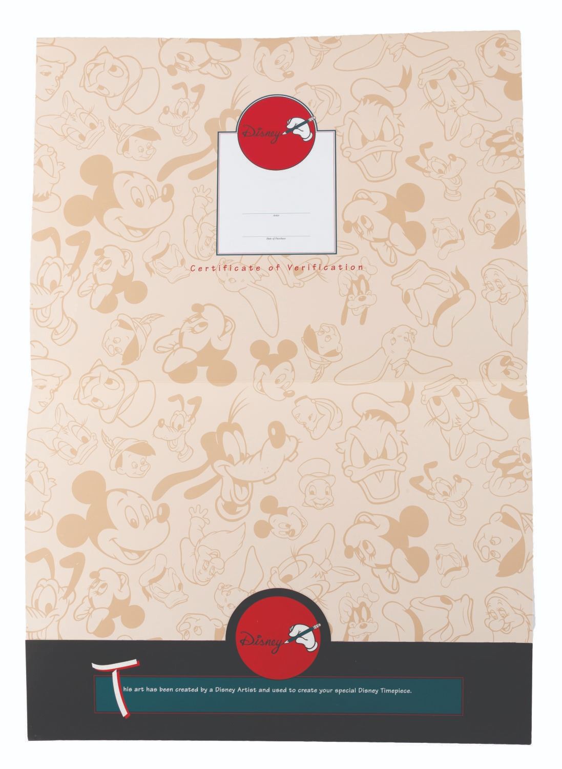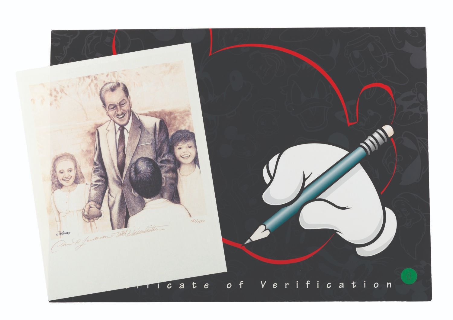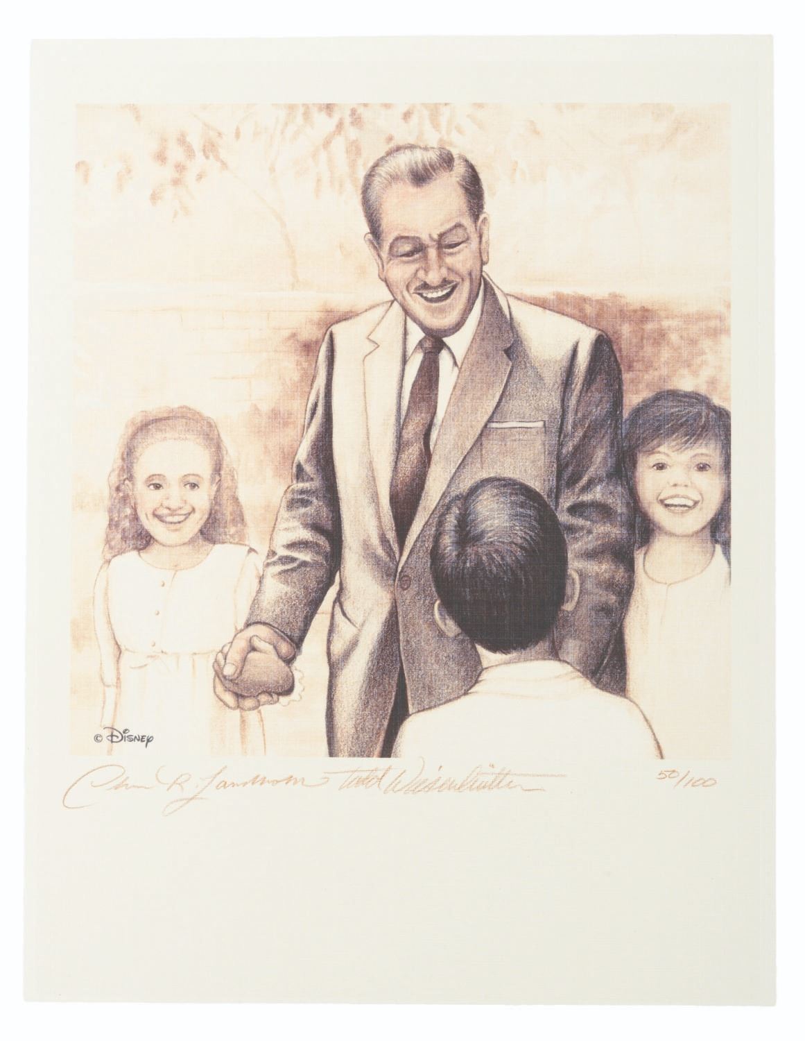 (Disney, 2002) An Uncle Walt "It Was All Started by a Man" print released in the Walt in Motion Pictures limited edition artisan watch series. Numbered 50/100, the print is signed by artists Charles Landholm and Todd Wiesenhütter, and the original accompanying watch is not included. Measuring 8.5" x 11", the print is presented in a 13" x 18" folder and is in fine condition.