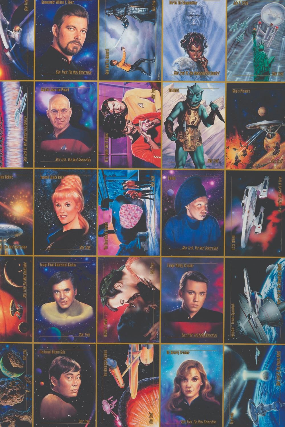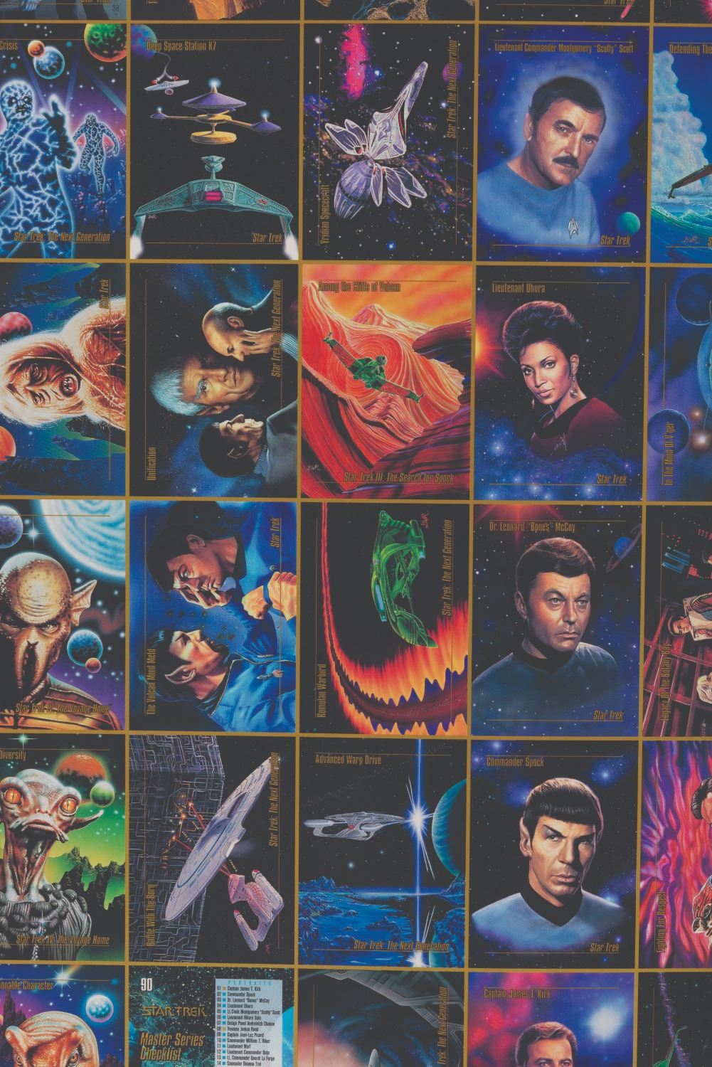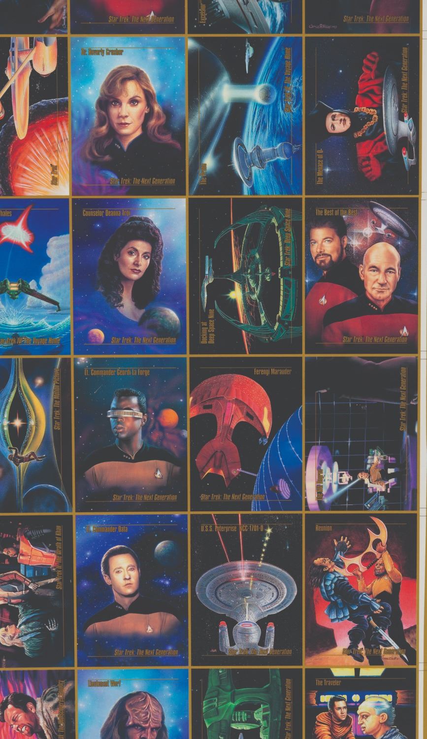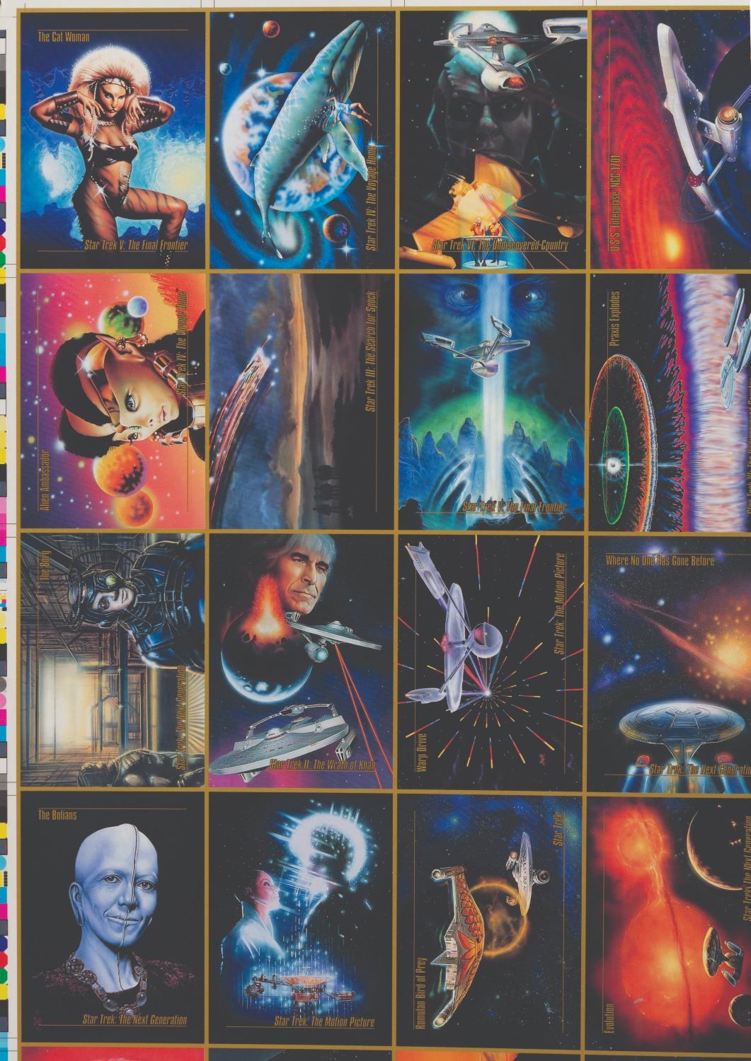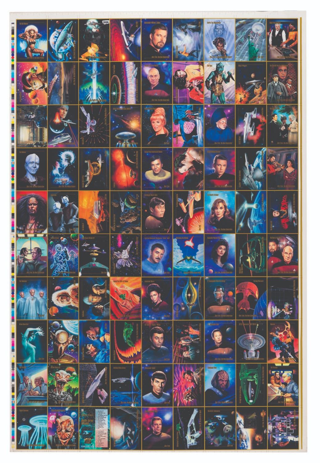 (Skybox, 1993) An uncut sheet of the full 90-card set of Master Series Star Trek cards from 1993. This is the first of two series of cards made completely from artist renderings, including characters and scenes from the Original Series, Next Generation, and the movies to date. Measuring 25.5" x 37.5", the sheet is in very good condition with two small creases in one edge in cards 68 and 75.