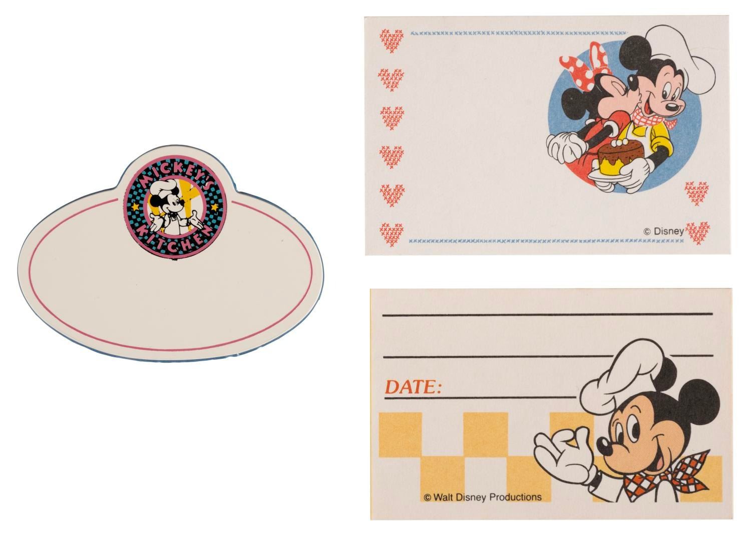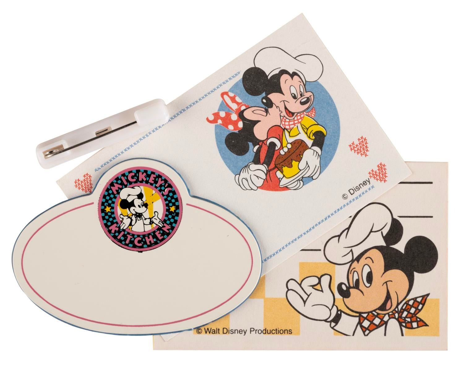 (Disney, 1992) A rare unused Cast Member name badge for "Mickey's Kitchen," a now defunct restaurant chain conceived to accompany the Disney Store. Measuring 2.5" x 1.75", the badge is in very good condition with some scratching on the reverse.