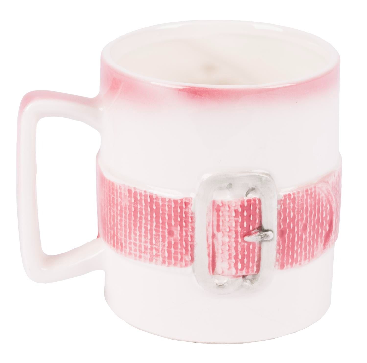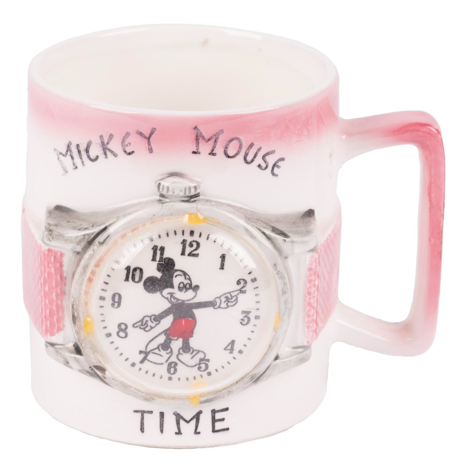 (Enesco, 1960s) A Mickey Mouse Time mug featuring a figural Mickey Mouse watch (non-functional) with a plastic crystal. Measuring 4" x 3.5" high, the mug is in very good condition, with small flecks of glue visible inside the plastic.
