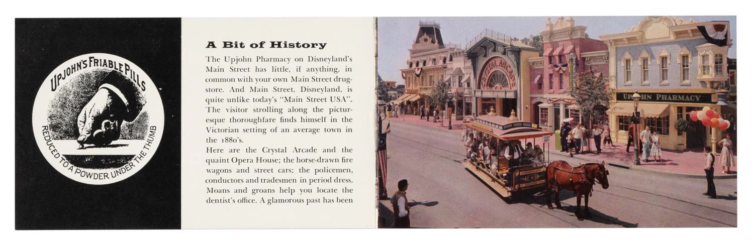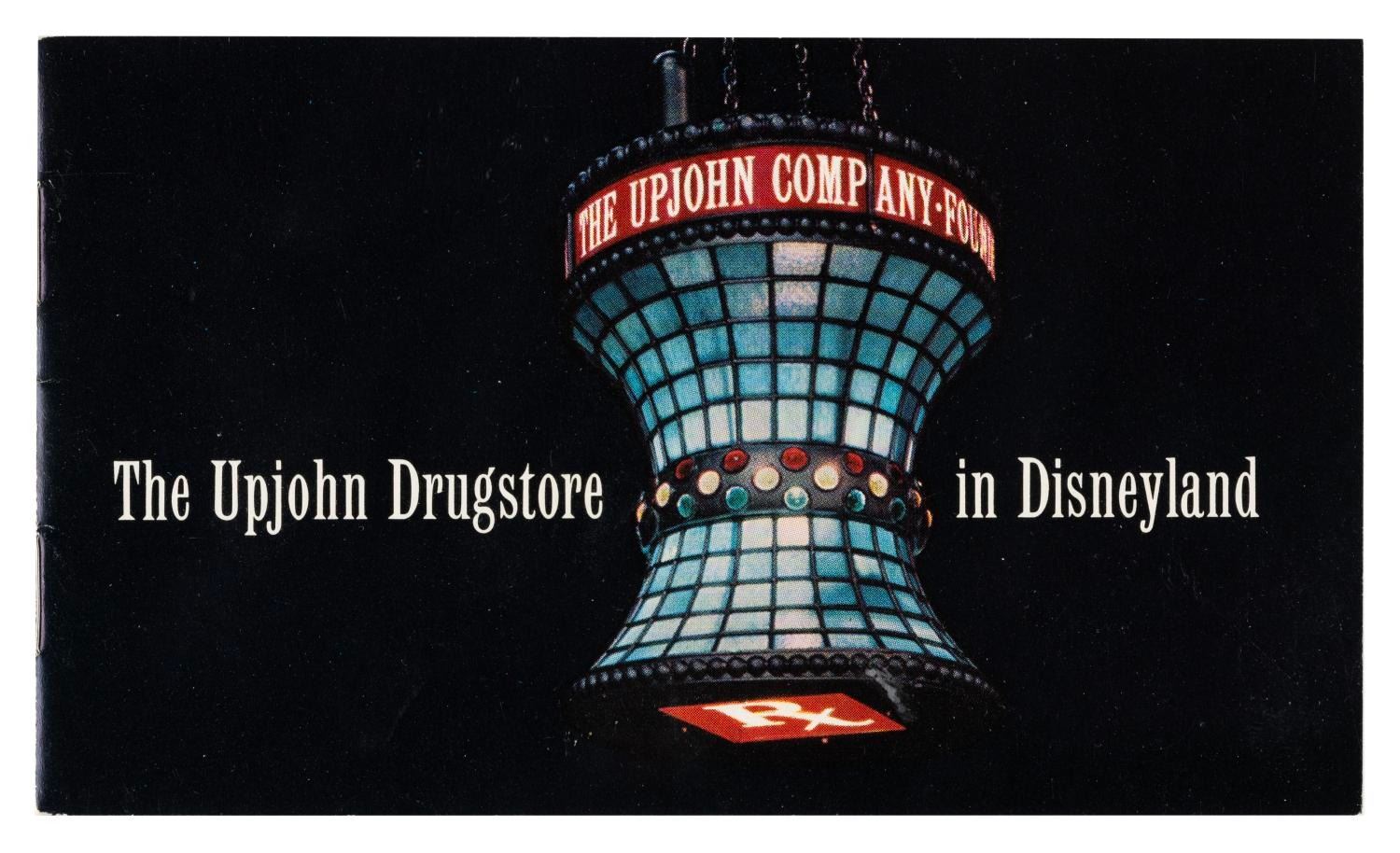 (Upjohn, 1955-70) A brochure about the Upjohn Pharmacy on Disneyland’s Main Street U.S.A. Measuring 3.25" x 5.5", the 16-page brochure is in very good condition with light handling wear.