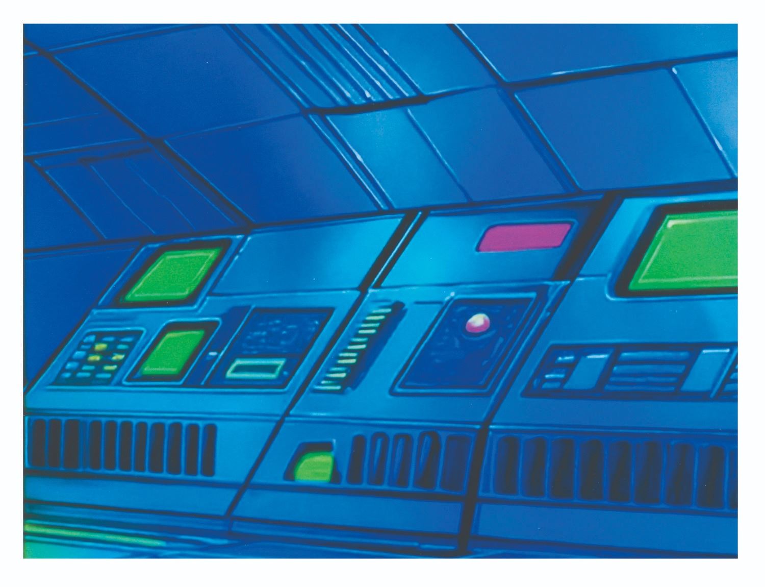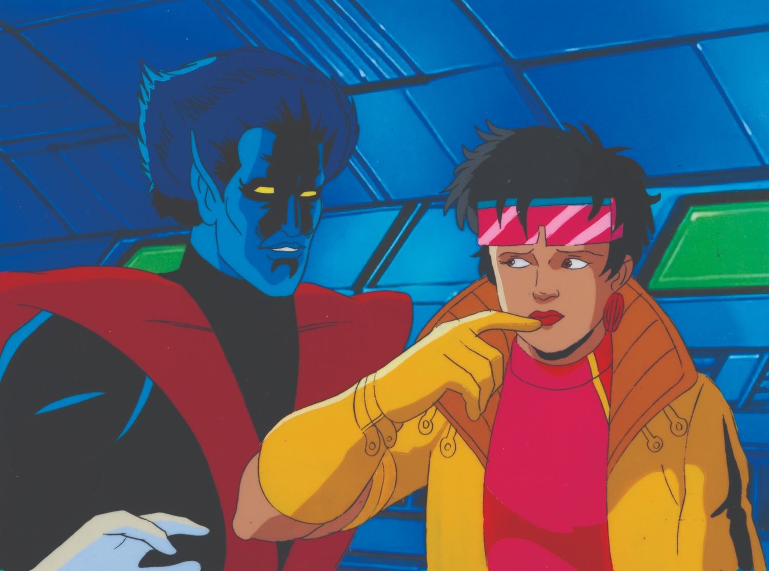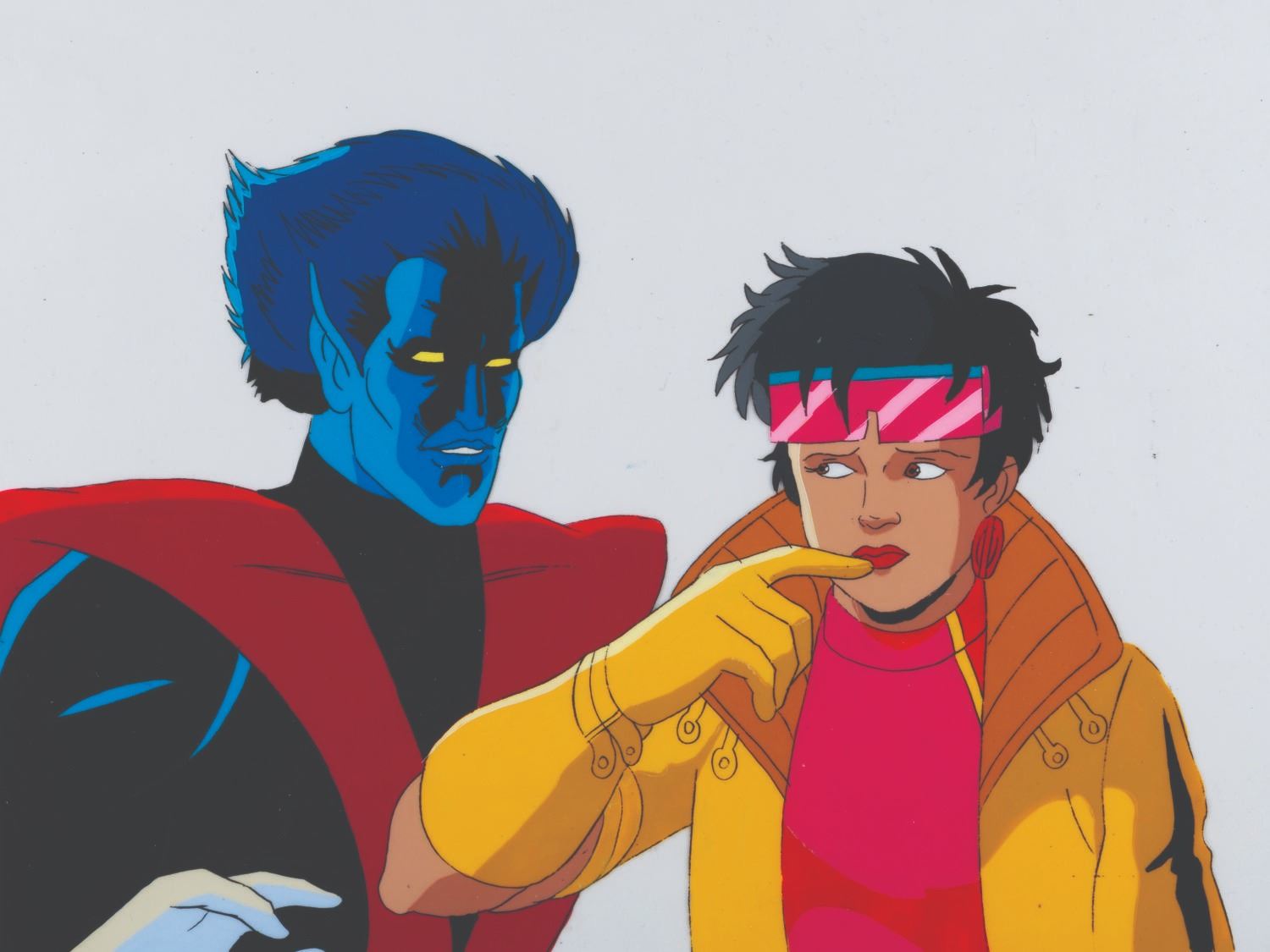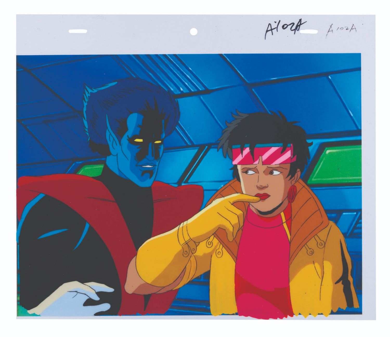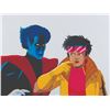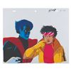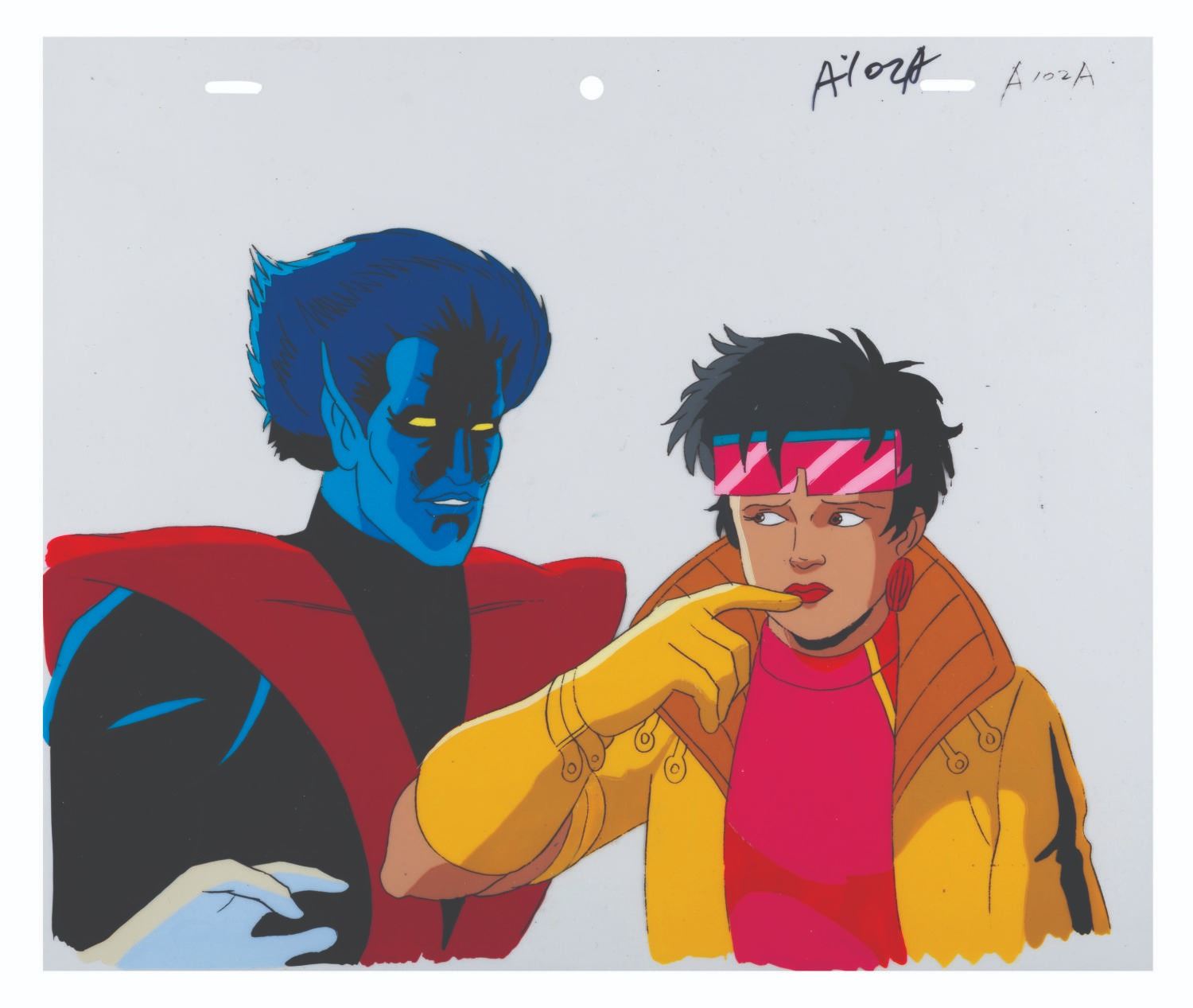 (Fox, 1996) An original production cel from “X-Men: The Animated Series” of Jubilee and Nightcrawler from the season four episode “Bloodlines” with a color copy background. Measuring 10.5” x 12.5" with a character image size of 8.5” x 12.5”, the cel is in fine condition.