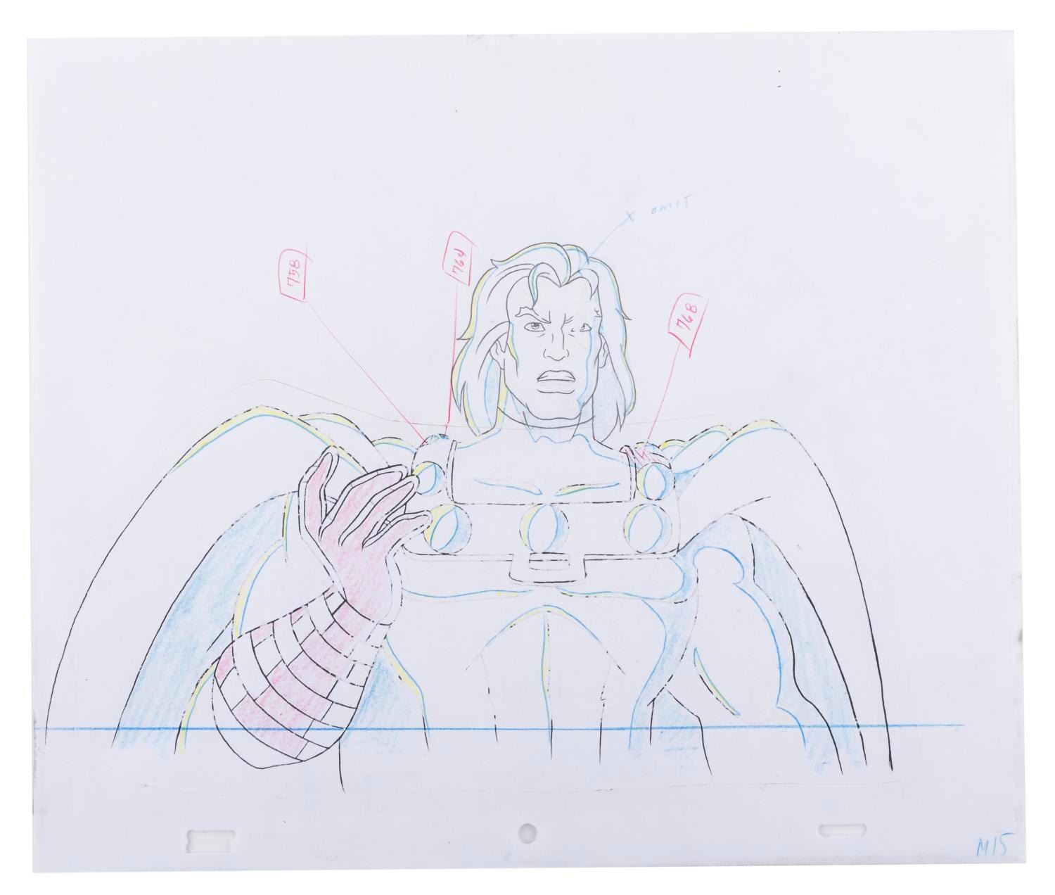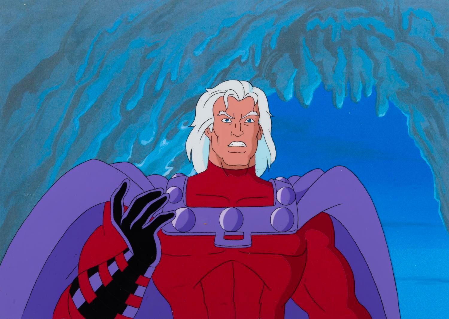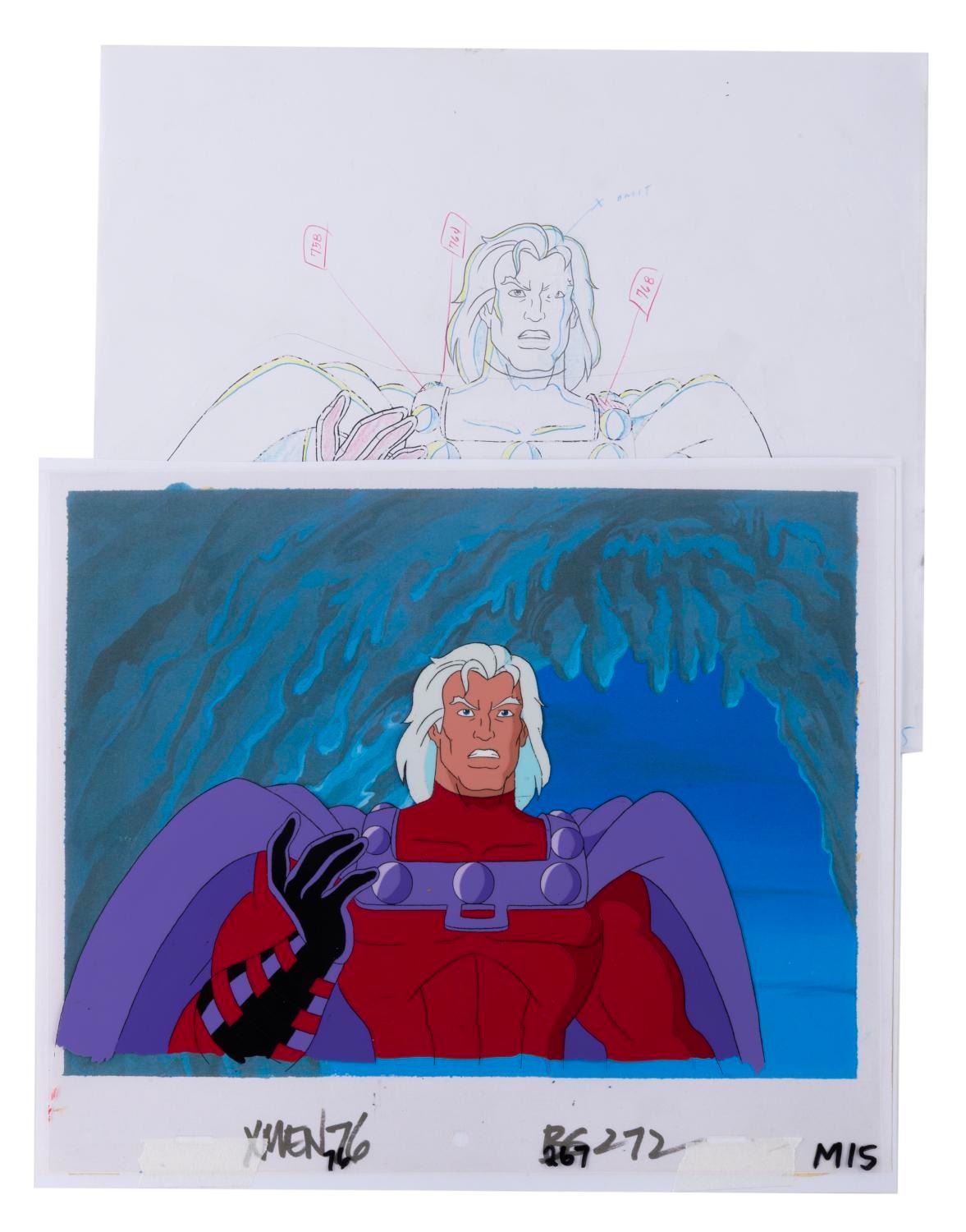 (Fox, 1997) An original production cel and color model drawing of Magneto from "X-Men: The Animated Series " series finale "Graduation Day. " Magneto has an image size of 6.5 " x 10.75 " on a 10.5 " x 12.5 " cel and animation paper. The cel displays in very good condition with scratches, wear from production use, and paper backing transfer on the reverse. The drawing is in fair condition, with Magneto's head hand-drawn and the rest of his body a color copy, which has been cut out and taped back together, exhibiting paper scrapes and wear.